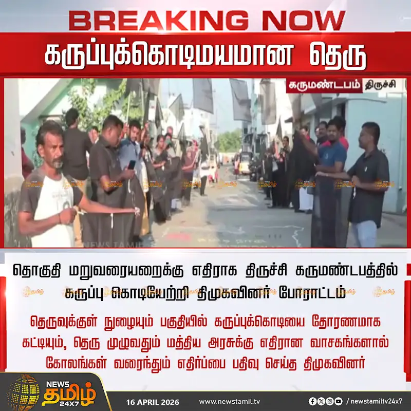 மத்திய அரசின் தொகுதி மறுவரையறை மசோதாவுக்கு எதிர்ப்பு தெரிவித்து முதல்வர் மு.க.ஸ்டாலின் போராட்டம் நடத்தினார். கருப்புக்கொடி ஏற்றியும், கருஞ்சட்டை அணிந்தும், மசோதா நகலை எரித்தும் முதலமைச்சர் முழக்கமிட்டார். தொகுதி மறுவரையறையால் தமிழ்நாடு உள்ளிட்ட தென்மாநிலங்கள் பாதிக்கும் என கூறி, மத்திய பாஜக அரசின் மோசடியான மசோதாவை இறுதி வரை எதிர்ப்போம் என மு.க.ஸ்டாலின் முழக்கம் எழுப்பினார். நாமக்கல், நல்லிப்பாளையத்தில் கட்சியினருடன் இணைந்து போராட்டத்தில் முதலமைச்சர் மு.க.ஸ்டாலின் ஈடுபட்டார்.