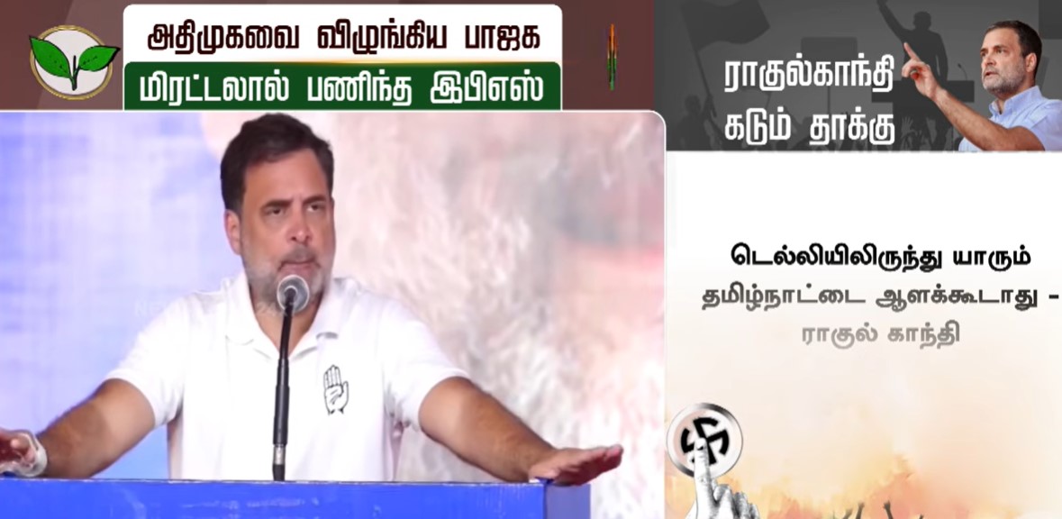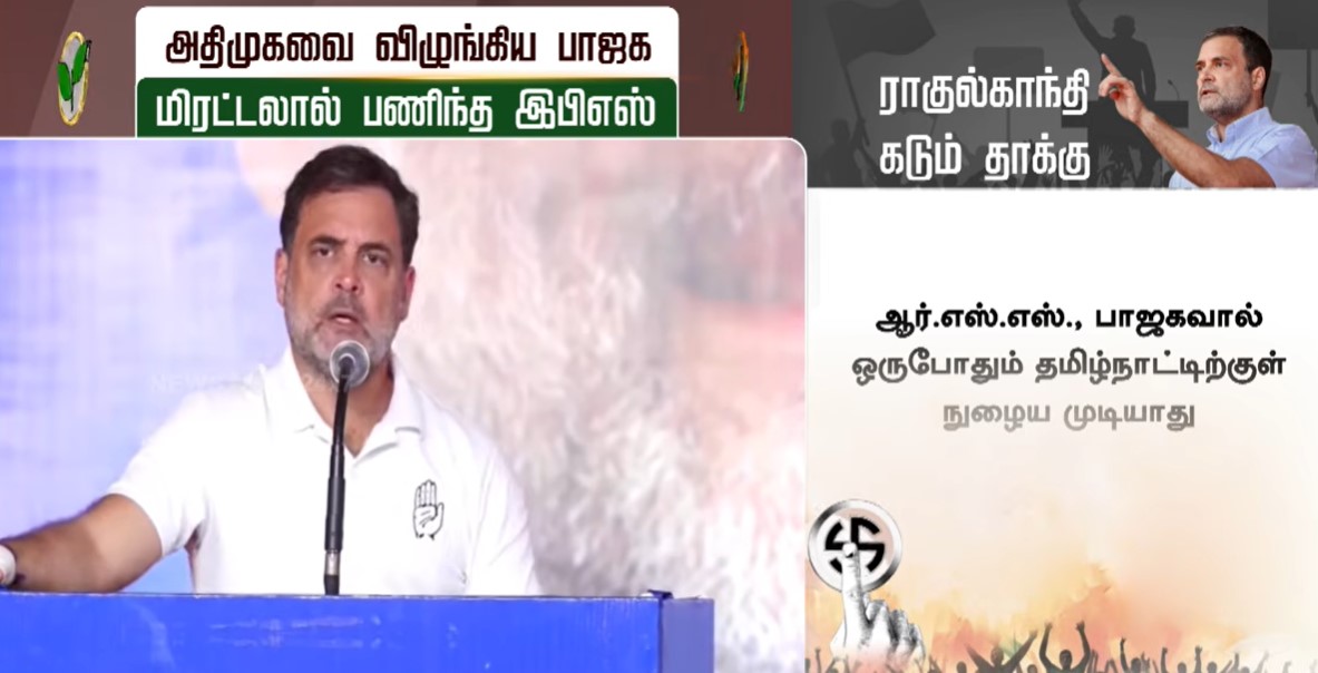 ராணிப்பேட்டை மாவட்டம், சோளிங்கரில் நடைபெற்ற தேர்தல் பரப்புரை கூட்டத்தில் பேசிய ராகுல்காந்தி, அடிப்படையிலேயே தமிழர்களுக்கு எதிரான பாஜக மற்றும் ஆர்.எஸ்.எஸ். ஒருபோதும் தமிழ்நாட்டிற்குள் நுழைய முடியாது என்றும் திட்டவட்டமாக தெரிவித்துள்ளார்.