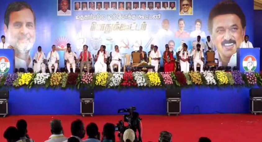 சோளிங்கர் அருகே பாண்டியநல்லூரில் மதச்சார்பற்ற முற்போக்கு கூட்டணி சார்பில் தேர்தல் பிரச்சார பொதுக்கூட்டம் நடைபெற்றது. கூட்டத்தில், மக்களவை எதிர்க்கட்சி தலைவர் ராகுல்காந்தி கலந்து கொண்டார். அப்போது, திமுக வேட்பாளர்கள் அமைச்சர் ஆர்.காந்தி, ஈஸ்வரப்பன், காங்கிரஸ் வேட்பாளர் ஏ.எம்.முனிரத்தினம், விசிக வேட்பாளர் எழில் கரோலின் ஆகியோரை ஆதரித்து ராகுல்காந்தி பேசியதாவது: