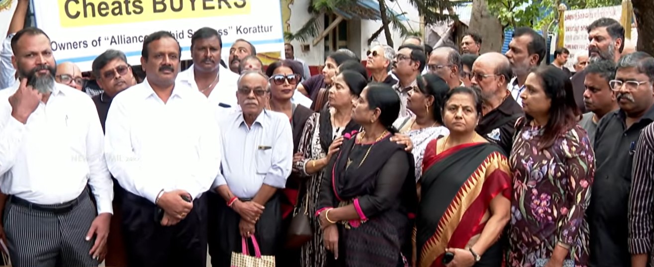 சென்னை, கொரட்டூர் பகுதியில், கோவில் நிலத்தில் அடுக்குமாடி குடியிருப்புகளை கட்டி, வீடுகளை விற்று 2 ஆயிரத்து 500 கோடி ரூபாய் அளவுக்கு ஏமாற்றி விட்டதாக, அலையன்ஸ் அர்பன்ரைஸ் (Alliance Urbanrise) என்ற தனியார் கட்டுமான நிறுவனத்திற்கு எதிராக, டிஜிபி அலுவலகத்தில் பாதிக்கப்பட்ட குடியிருப்புவாசிகள் புகாரளித்துள்ளனர். கோடிகளை கொட்டி வாங்கிய வீடுகளின் மதிப்பு ஜீரோ ஆனதன் அவலத்தை பற்றி விவரிக்கிறது இந்த செய்தி தொகுப்பு.