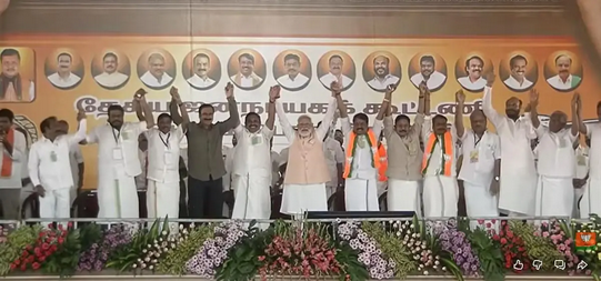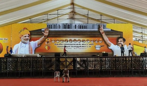 அதிமுக தலைமையிலான தேசிய ஜனநாயக கூட்டணியின் பொதுக்கூட்டம் செங்கல்பட்டு மாவட்டம், மதுராந்தகத்தில் மிக பிரம்மாண்டமான முறையில் நடைபெற்றது. கூட்டணி கட்சித்தலைவர்களின் புகைப்படங்கள் அடங்கிய பேனர் மேடையில் வைக்கப்பட்டு மோடி ஒருபுறமும் இபிஎஸ் மறுபுறமும் என பெரிய அளவிலான புகைப்படமும் அதையொட்டி சின்னங்களும் இடம்பெற்றிருந்தன. செயிண்ட் ஜார்ஜ் கோட்டையை மையப்படுத்தி மேடையும், டெல்லி செங்கோட்டையை மையப்படுத்தி முகப்பு பகுதியும் வடிவமைக்கப்பட்டிருந்தது.