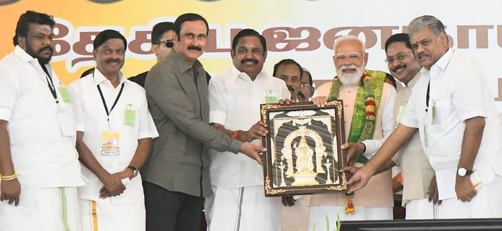தொடர்ந்து பிரதமர் மோடிக்கு எடப்பாடி பழனிசாமி சால்வை மற்றும் மாலை அணிவித்து திருப்பரங்குன்றம் முருகன் சிலையை நினைவுப்பரிசாக வழங்கினார். அவரை பின்பற்றி, மற்ற கூட்டணி கட்சித் தலைவர்களும் பிரதமருக்கு மரியாதை செலுத்தினர்.