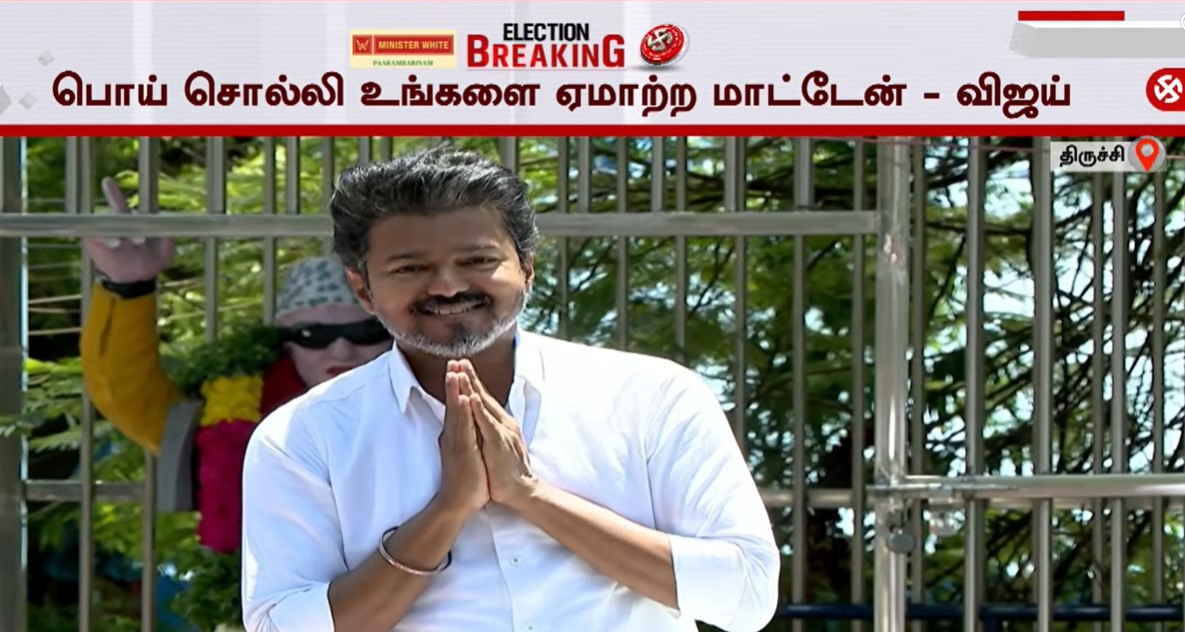 திருச்சி கிழக்கு சட்டமன்றத் தொகுதியில் எம்.ஜி.ஆர்.சிலைக்கு மாலை அணிவித்துவிட்டு விஜய் பிரச்சாரத்தை தொடங்கினார். தன்னை 100 சதவீதம் நம்பி தனக்கு ஒரு வாய்ப்பு வழங்குமாறு இருகரம் கூப்பி மக்களிடம் வேண்டுகோள் விடுத்தார். கரூர் நிகழ்ச்சி எப்படி ஒரு சூழ்ச்சியோ, அதேபோல், ஜனநாயகன் பட வெளியீட்டுக்கும் கூட்டு சதி நடைபெறுகிறது. திமுக வேறு, பாஜக வேறு அல்ல இரண்டுமே ஒன்று தான் என்றும் தவெக தலைவர் விஜய் ஆவேசமாக பேசினார்.