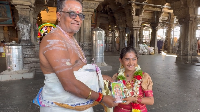 இதற்காக வந்த தியாவிற்கு மாலை அணிவித்து கோயில் பிரசாதம் கொடுத்து உற்சாக வரவேற்பளிக்கப்பட்டது. அதனைத் தொடர்ந்து சிறுமி தியா பக்தி பாடல்களை பாடி அசத்தினார். இதனை பார்த்த பக்தர்கள் மெய்சிலிர்த்தனர். மேலும் பக்தர்கள் ஆர்வத்துடன் செல்பி எடுத்துக் கொண்டனர்.