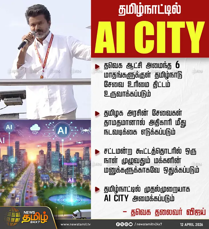 தவெக ஆட்சி அமைந்த 6 மாதங்களுக்குள் தமிழ்நாடு சேவை உரிமை திட்டம் உருவாக்கப்படும், தமிழக அரசின் சேவைகள் தாமதமானால் அதிகாரி மீது நடவடிக்கை எடுக்கப்படும், சட்டமன்ற கூட்டத்தொடரில் ஒரு நாள் முழுவதும் மக்களின் மனுக்களுக்காகவே ஒதுக்கப்படும், தமிழ்நாட்டில் முதல்முறையாக AI CITY அமைக்கப்படும் என்றும், தவெக தலைவர் விஜய் அறிவித்துள்ளார்.