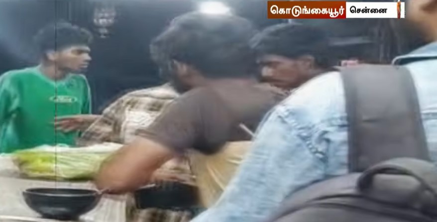 கொடுங்கையூர், கவியரசு கண்ணதாசன் நகர் அருகே வெற்றி வேல் என்பவர் வெற்றி ஃபாஸ்ட் ஃபுட் என்ற உணவகத்தை நடத்தி வருகிறார். சம்பவத்தன்று இரவு வாடிக்கையாளர் பலர் சாப்பிடவும், பார்சல் வாங்கி செல்லவும் காத்திருந்தனர். அப்போது, கஞ்சா போதையில் வந்த இரண்டு இளைஞர்கள் ஓசியில் உணவு கேட்டதாகவும், அதற்கு கடையின் உரிமையாளர் வெற்றிவேல் மறுத்ததாகவும் கூறப்படுகிறது. இதுதொடர்பாக ஏற்பட்ட வாக்குவாதத்தில் ஆத்திரமடைந்த இளைஞர்கள், காது கூசும் ஆபாச வார்த்தைகளை அள்ளி தெளித்ததோடு, பாத்திரங்களை தூக்கி கடை உரிமையாளர் மீது வீசி தாக்குதல் நடத்த தொடங்கினர்.