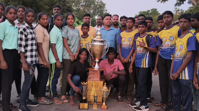 சென்னையில், மாநில அளவில் ஆதரவற்ற பள்ளி விடுதி மாணவ, மாணவிகளுக்கு இடையில் நடந்த விளையாட்டு மற்றும் கலை நிகழ்ச்சிகள் போட்டியில் ஓட்டுமொத்த சாம்பியன் கோப்பை வென்ற தஞ்சை மாணவ, மாணவிகளுக்கு தஞ்சை ரயில் நிலையத்தில்பேண்ட் வாத்திய இசையுடன் உற்சாக வரவேற்பு அளிக்கப்பட்டது.மண்டல அளவிலான விளையாட்டு போட்டிகள்குழந்தைகள் சிறப்பு சேவைகள் துறை சார்பில் அரசு விடுதிகளில் தங்கி படித்து வரும் ஆதரவற்ற மாணவ மாணவிகள் இடையில் மண்டல அளவிலான விளையாட்டு மற்றும் கலை நிகழ்ச்சிகள் போட்டிகள் நடந்தன. இதில் தஞ்சை, ராணிப்பேட்டை, தூத்துக்குடி, சென்னை ஆகிய நான்கு மண்டலங்களாக போட்டிகள் நடைபெற்றன.தஞ்சை சார்பில் 88 பேர் பங்கேற்புமண்டல அளவிலான போட்டியில் வெற்றி பெற்றவர்கள் சென்னையில் 22 மற்றும் 23 ஆகிய இரண்டு நாட்கள் நடைப்பெற்ற மாநில அளவிலான போட்டியில் கலந்து கொண்டனர். அதில் தஞ்சை மண்டலம் சார்பில் 52 மாணவிகள், 36 மாணவர்கள் என 88 பேர் பங்கேற்றனர்.பேண்ட் வாத்திய இசையுடன் உற்சாக வரவேற்புஅத்லட்டிக் வாலிபால், கபடி, பேட்மிட்டன் உள்ளிட்ட அனைத்து விளையாட்டு போட்டிகளிலும், ஓவியம், நடனம், பாட்டு உள்ளிட்ட அனைத்து கலை நிகழ்ச்சிகள் போட்டிகளிலும் வென்று தஞ்சை மண்டலம் அணியினர் ஒட்டுமொத்த சாம்பியன் கோப்பை வென்றனர்.வெற்றி கோப்பையுடன் ரயில் மூலம் தஞ்சை ரயில் நிலையம் வந்து இறங்கிய மாணவ, மாணவிகளுக்கு பேண்ட் வாத்திய இசையுடன் உற்சாக வரவேற்பு அளிக்கப்பட்டது. Related Link 49ஆண்டுக்கு பிறகு சாதித்த அரசுப்பள்ளி