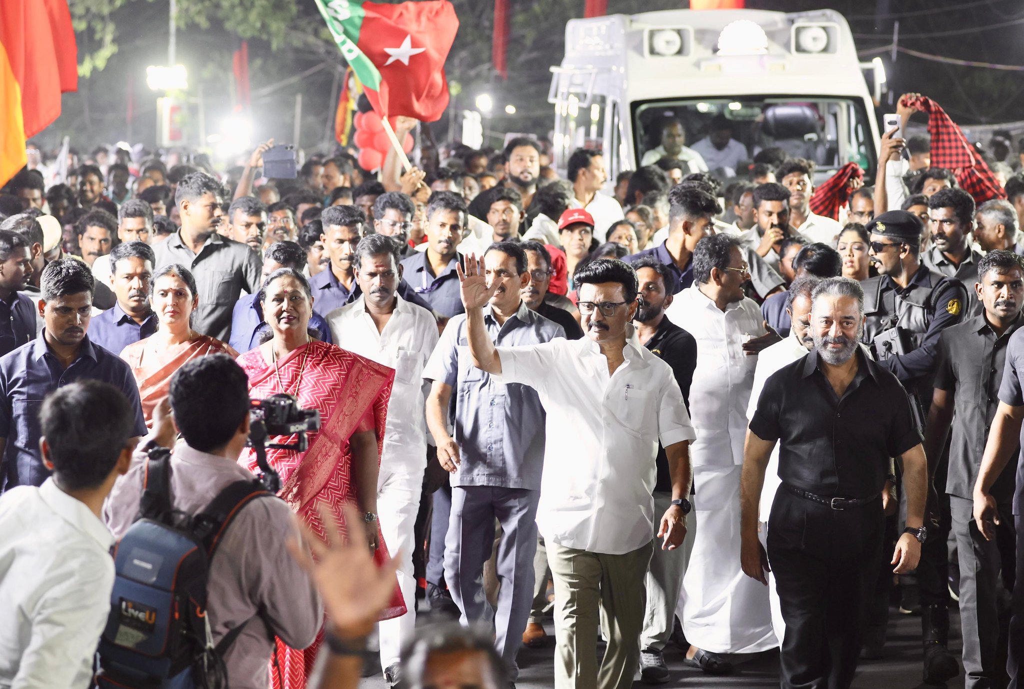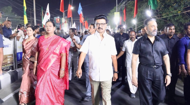 தமிழக சட்டப்பேரவைத் தேர்தல் நெருங்கி வரும் நிலையில், தருமபுரி பிரச்சாரத்திற்கு பின் சேலம் சென்ற முதலமைச்சர் ஸ்டாலின் தலைமையில் பிரம்மாண்ட பேரணி நடைபெற்றது. இதில் மக்கள் நீதி மையம் கட்சித் தலைவர் கமலஹாசன், தேமுதிக பொதுச்செயலாளர் பிரேமலதா உள்ளிட்டோர் பங்கேற்றனர்.
