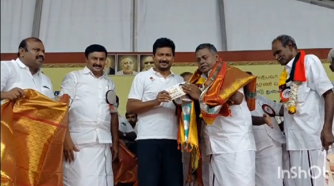 இதனை தொடர்ந்து திமுக மூத்த முன்னோடிகளுக்கு பொற்கிழி வழங்கும் நிகழ்ச்சி நாடாளுமன்ற உறுப்பினர் அலுவலகம் அருகே நடைபெற்றது. இதில் திருப்பூர் தெற்கு மாவட்ட அளவிலான திமுக மூத்த முன்னோடிகள் 1,200 பேருக்கு சால்வை அணிவித்து, பொற்கிழியை வழங்கி துணை முதல்வர் உதயநிதி ஸ்டாலின் கௌரவித்தார். பின்னர் நிகழ்ச்சியில் பேசிய உதயநிதி ஸ்டாலின் இந்த நிகழ்ச்சிக்கு துணை முதல்வராகவோ, இளைஞரணி செயலாளராகவும் நான் வரவில்லை உங்களின் பேரனாக உங்களைப் பார்க்க வந்துள்ளேன்" என நெகிழ்ச்சியாக கூறினார்.