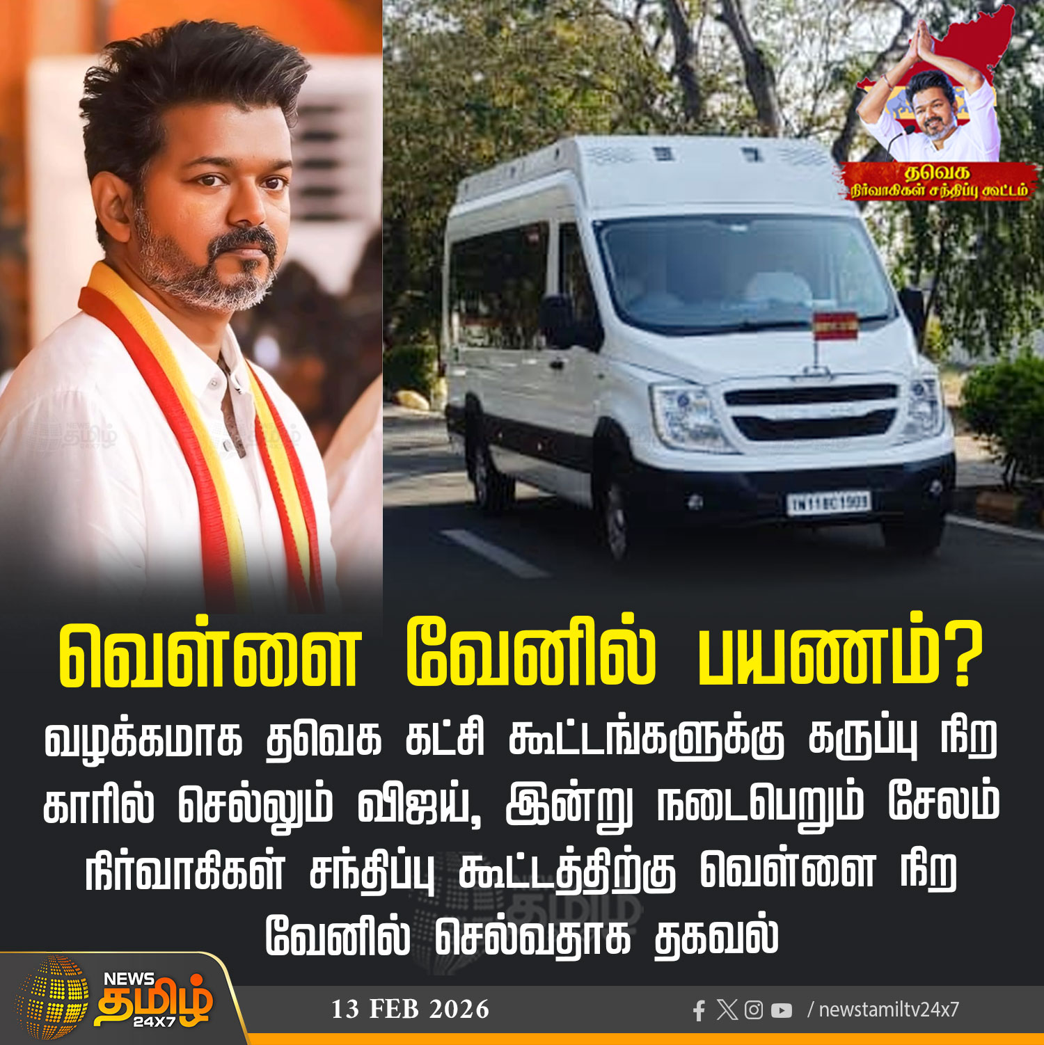 வழக்கமாக தவெக கட்சி கூட்டங்களுக்கு கருப்பு நிற காரில் செல்லும் விஜய், இன்று நடைபெறும் சேலம் நிர்வாகிகள் சந்திப்பு கூட்டத்திற்கு வெள்ளை நிற வேனில் செல்வதாக தகவல்