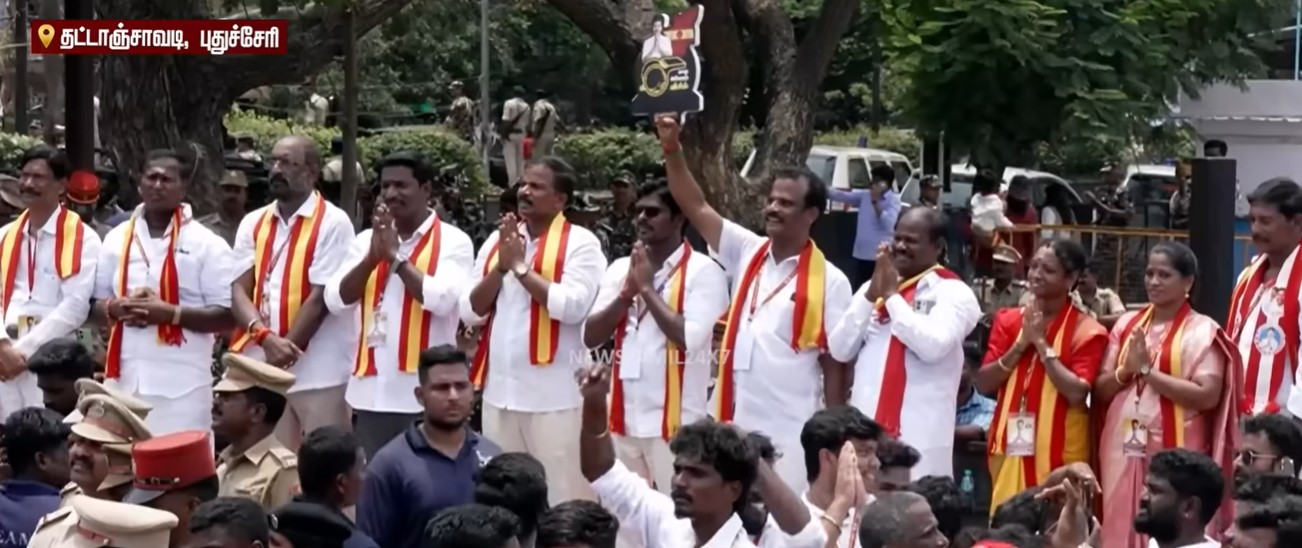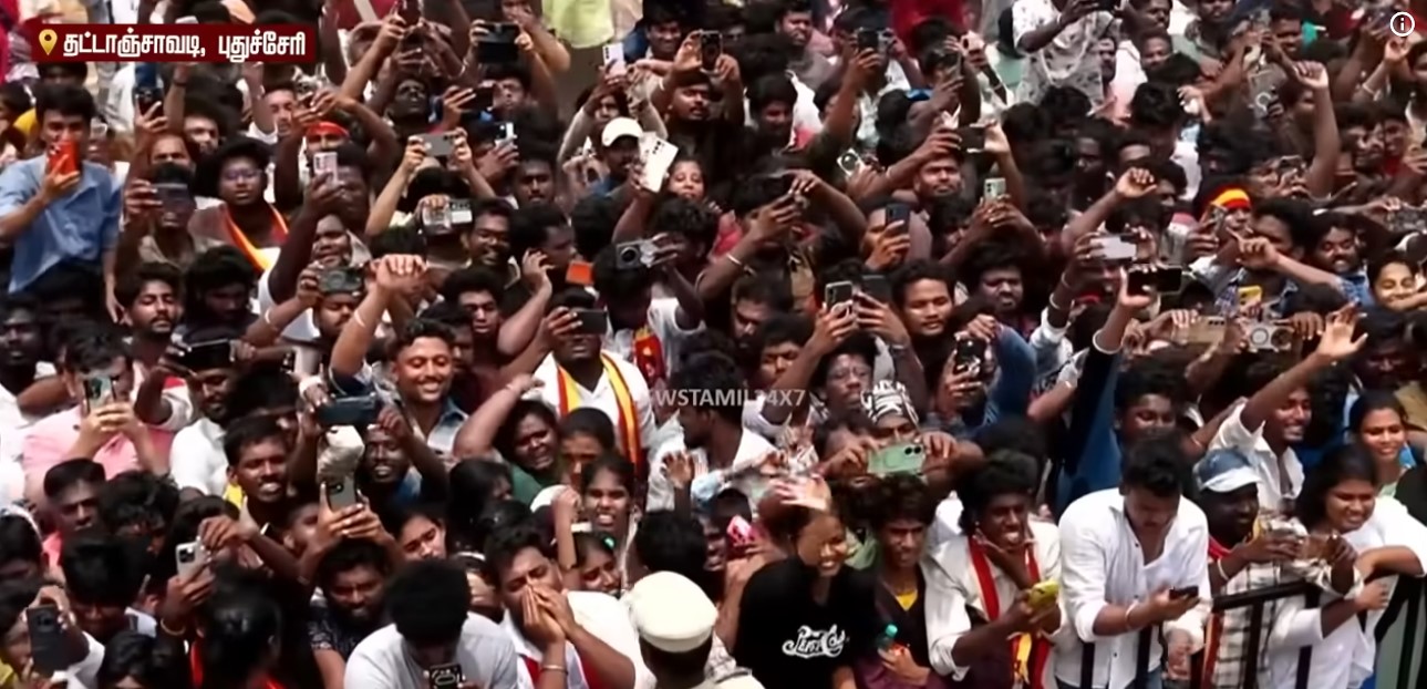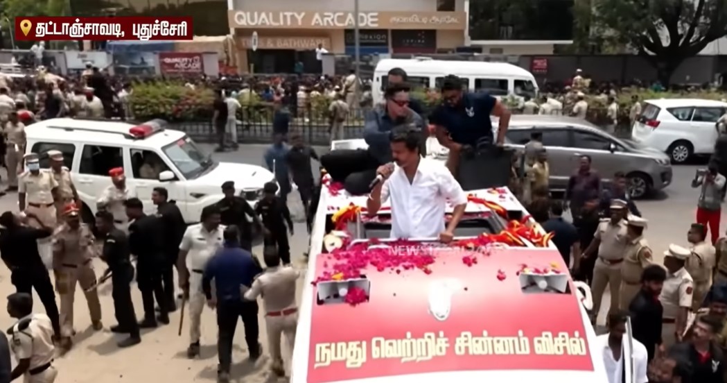எங்கு பார்த்தாலும் மக்கள் கூட்டம், திரும்பிய பக்கமெல்லாம் வரவேற்பு என புதுச்சேரியே விஜய்யின் வருகையால் குலுங்கி போய் விட்டது என்று தான் சொல்ல வேண்டும். புதுச்சேரியில் ஏப்ரல் 9ஆம் தேதி சட்டமன்ற தேர்தல் நடைபெறும் நிலையில், த.வெ.க. மற்றும் கூட்டணி கட்சி வேட்பாளர்களை ஆதரித்து விஜய் வாக்கு சேகரித்தார். சென்னையில் இருந்து ரேஞ்ச் ரோவர் கருப்பு நிற காரில் புறப்பட்ட விஜய்யை, ஏராளமான ரசிகர்கள் பின் தொடர்ந்து சென்றனர். புதுச்சேரிக்குள் நுழையும் போது காரில் இருந்து பிரச்சார வேனுக்கு மாறிய விஜய், சாலை வலம் சென்றார்.
