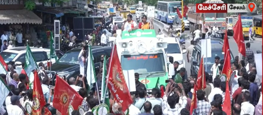 மேட்டூர் அருகே மேச்சேரி பேருந்து நிலையத்தில் நாம் தமிழர் கட்சி ஒருங்கிணைப்பாளர் சீமான், மேட்டூர் சட்டமன்ற தொகுதி வேட்பாளர் வித்யா ராணியை ஆதரித்து தேர்தல் பிரச்சாரம் மேற்கொண்டார்.
