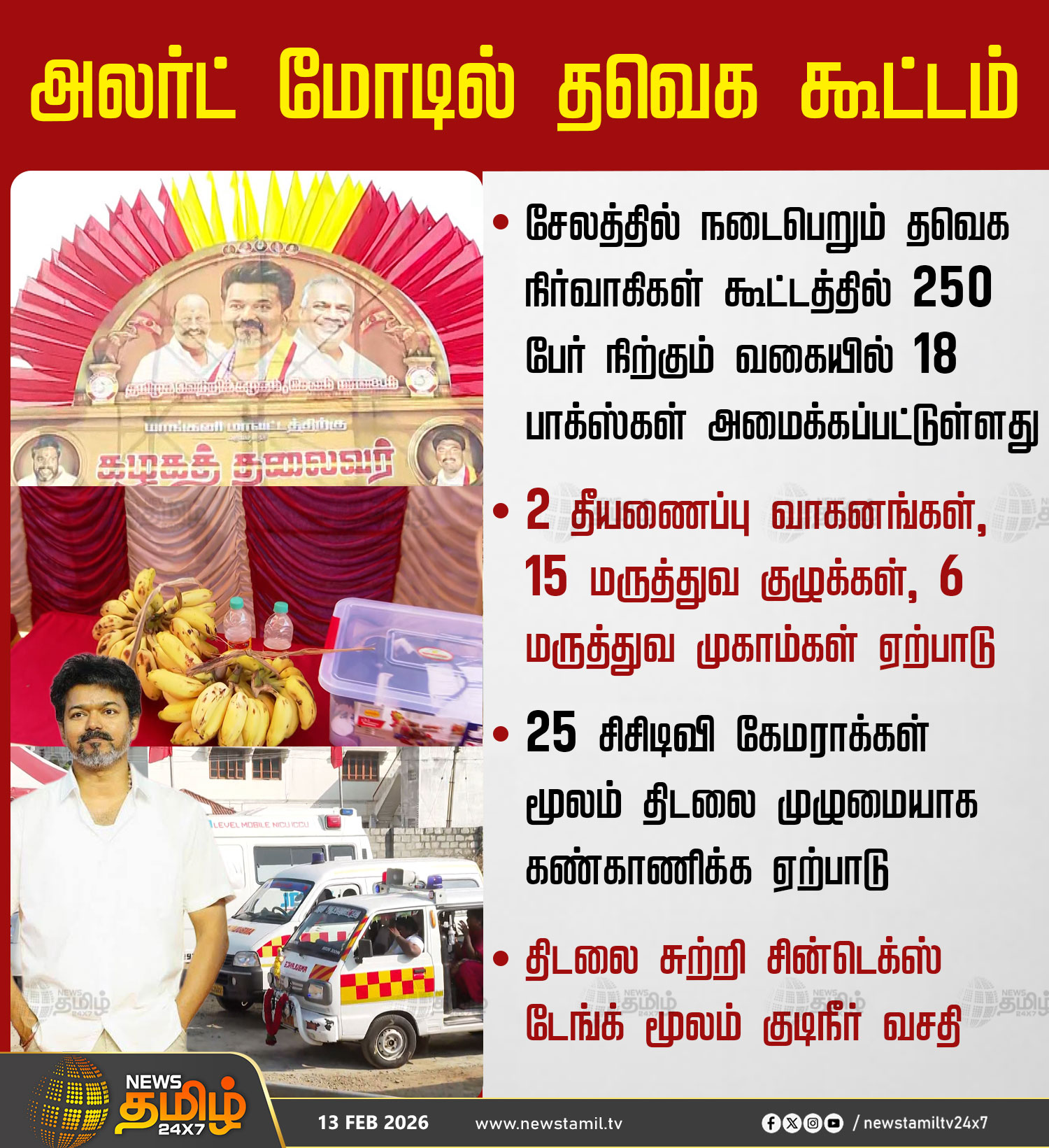 சேலம் மாவட்டம், சீலநாயக்கன்பட்டியில் இன்று விஜயின் நிர்வாகிகள் சந்திப்பு கூட்டம் நடைபெறுகிறது. தவெக நிர்வாகிகள் கூட்டம் சேலத்தில் இன்று விஜய் தலைமையில் தவெக நிர்வாகிகள் கூட்டம் நடைபெறுகிறது. சட்டமன்ற தேர்தலுக்கான முன்னேற்பாடுகள் குறித்து ஆலோசனை நடைபெறுகிறது. இந்த கூட்டத்திற்கு க்யூ ஆர் கோடுடன் கூடிய நுழைவுச் சீட்டு இருந்தால் மட்டுமே அனுமதி அளிக்கப்படுகிறது. தவெக திடல் தயார்சேலம் தவெக நிர்வாகிகள் கூட்டம் நடைபெறும் திடலுக்குள் தண்ணீர் பாட்டில்கள் வைக்கப்பட்டுள்ளன. மருத்துவக்குழுவினரும் தயார் நிலையில் உள்ளனர்; மெட்டல் டிடெக்டர் மூலம் சோதனை செய்யப்பட்ட பின்னரே அனுமதி அளிக்கப்படுகிறது. தவெக நிர்வாகிகள், ஒவ்வொருவராக திடலுக்குள் அனுமதிக்கப்படுவார்கள் என தகவல் தெரிவிக்கப்பட்டுள்ளது. அலர்ட் மோடில் தவெக கூட்டம்சேலத்தில் நடைபெறும் தவெக நிர்வாகிகள் கூட்டத்தில் 250 பேர் நிற்கும் வகையில் 18 பாக்ஸ்கள் அமைக்கப்பட்டுள்ளது. 2 தீயணைப்பு வாகனங்கள், 15 மருத்துவ குழுக்கள், 6 மருத்துவ முகாம்கள் ஏற்பாடு செய்யப்பட்டுள்ளது. 25 சிசிடிவி கேமராக்கள் மூலம் திடலை முழுமையாக கண்காணிக்க ஏற்பாடு செய்யப்பட்டுள்ளது. திடலை சுற்றி சின்டெக்ஸ் டேங்க் மூலம் குடிநீர் வசதி செய்யப்பட்டுள்ளது. Related Link தளபதிய First Time பாக்க போறேன்