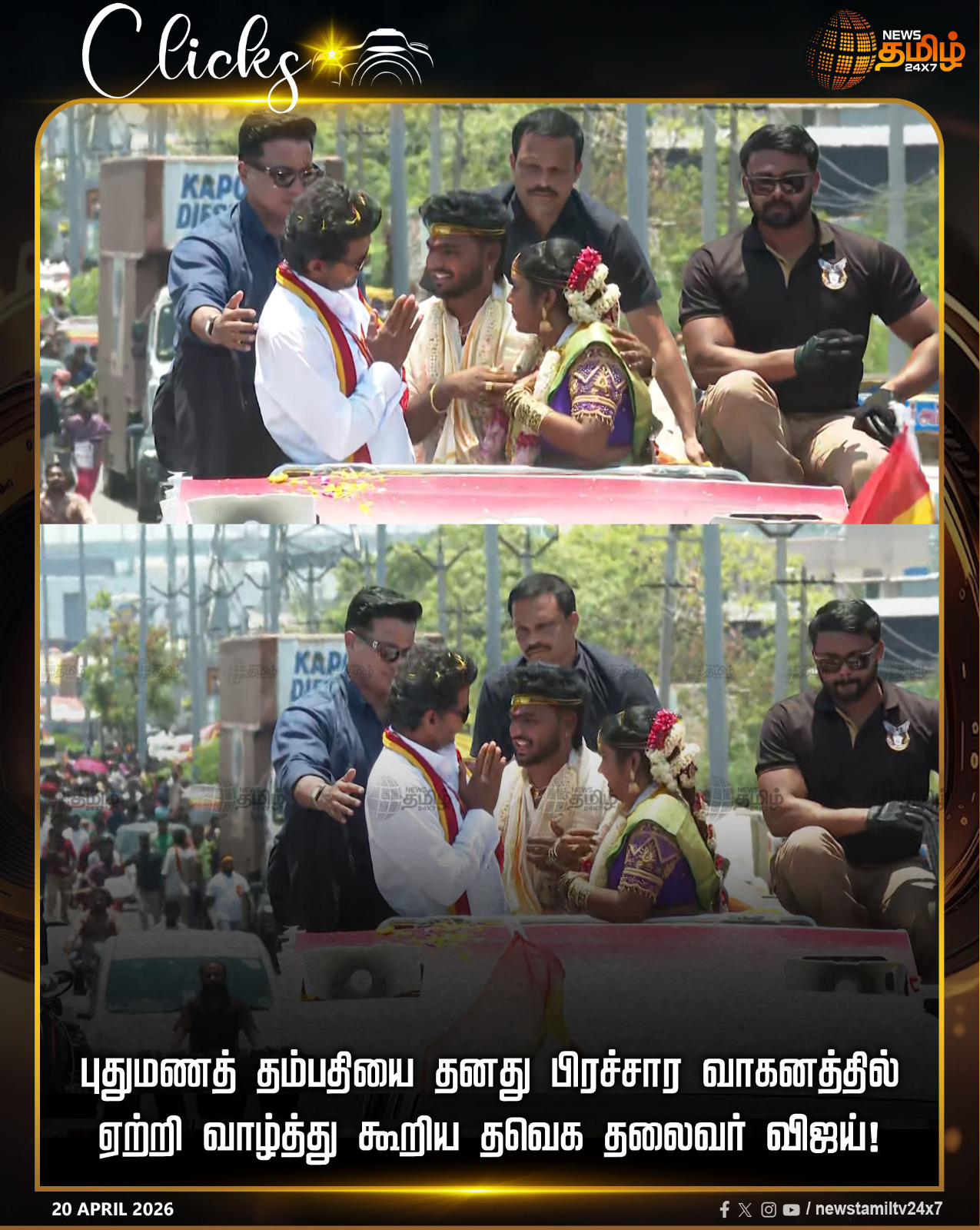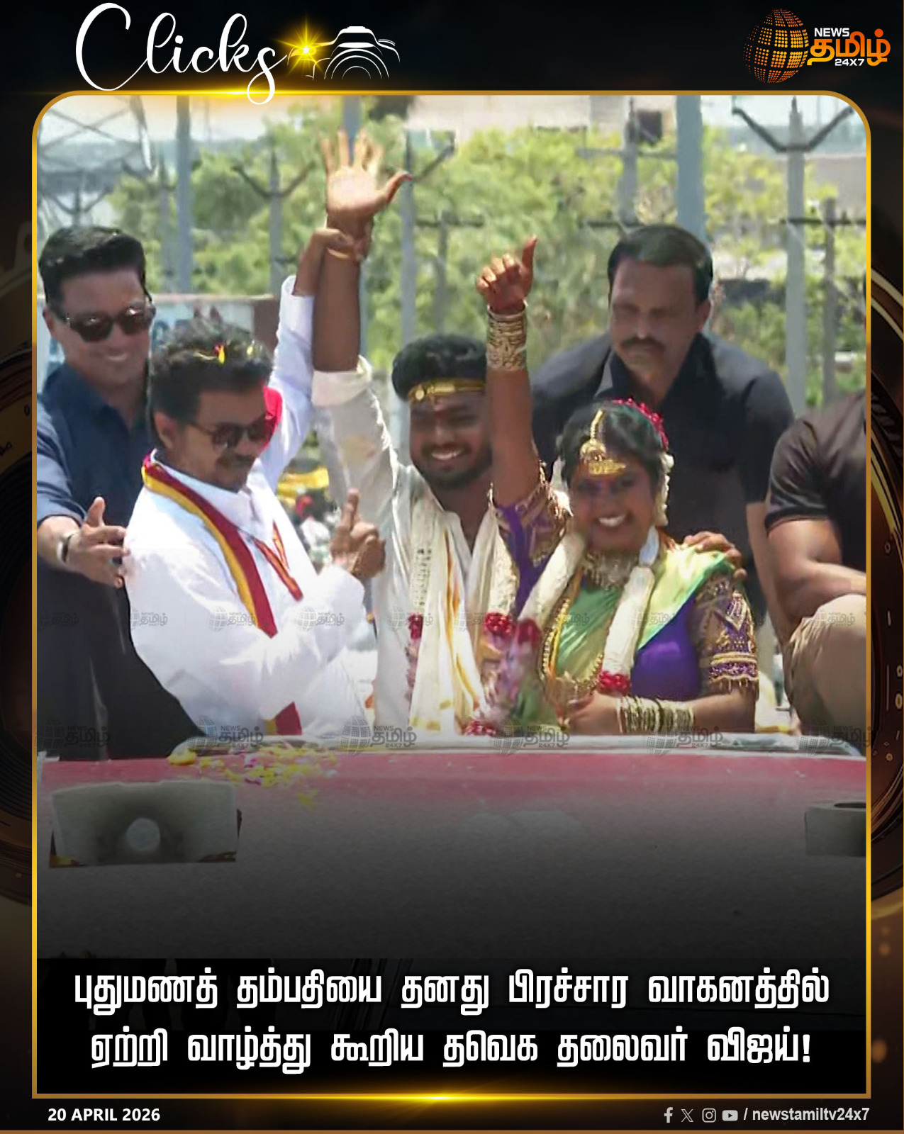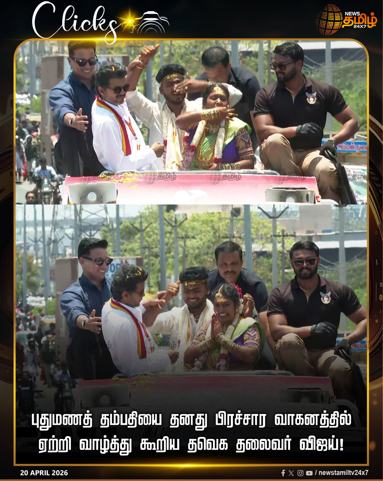 பேரணி சென்ற தவெக தலைவர் விஜய் வாகனத்தில் ஏறி, புதுமண தம்பதி ஆசி பெற்றுள்ளனர்.