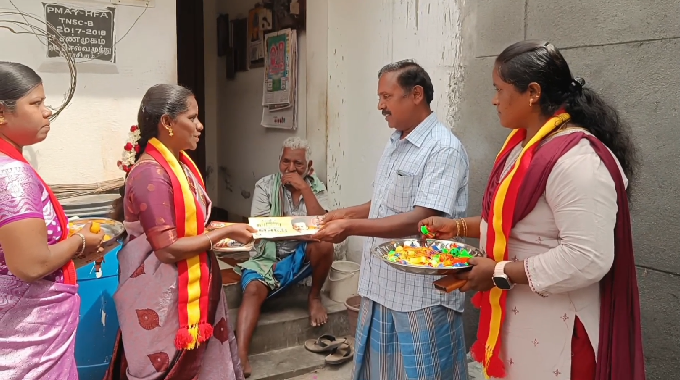நோட்டு, பேனா, இனிப்புகள் வழங்கிய தவெக நிர்வாகிகள்