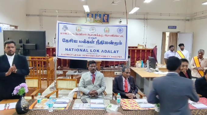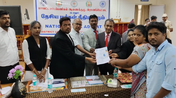 ராணிப்பேட்டை மாவட்ட ஒருங்கிணைந்த நீதிமன்ற வளாகத்தில் இன்று தேசிய அளவிலான மக்கள் நீதிமன்றம் நிகிழ்வு மாவட்ட நீதிபதி M.செல்வம் தலைமையில் நடைபெற்றது. முதலாம் கூடுதல் மாவட்ட நீதிபதி பாலகிருஷ்ணன் சார்பு நீதிபதி முனுசாமி ஆகியோர் முன்னிலை வகித்தனர். மேலும் மக்கள் நீதிமன்றத்தில் மோட்டார் வாகன விபத்து வழக்குகள், அசல் வழக்குகள், குடும்ப நல வழக்குகள் உட்பட பல்வேறு வழக்குகள் விசாரணைக்கு எடுத்து கொள்ளப்பட்டது..