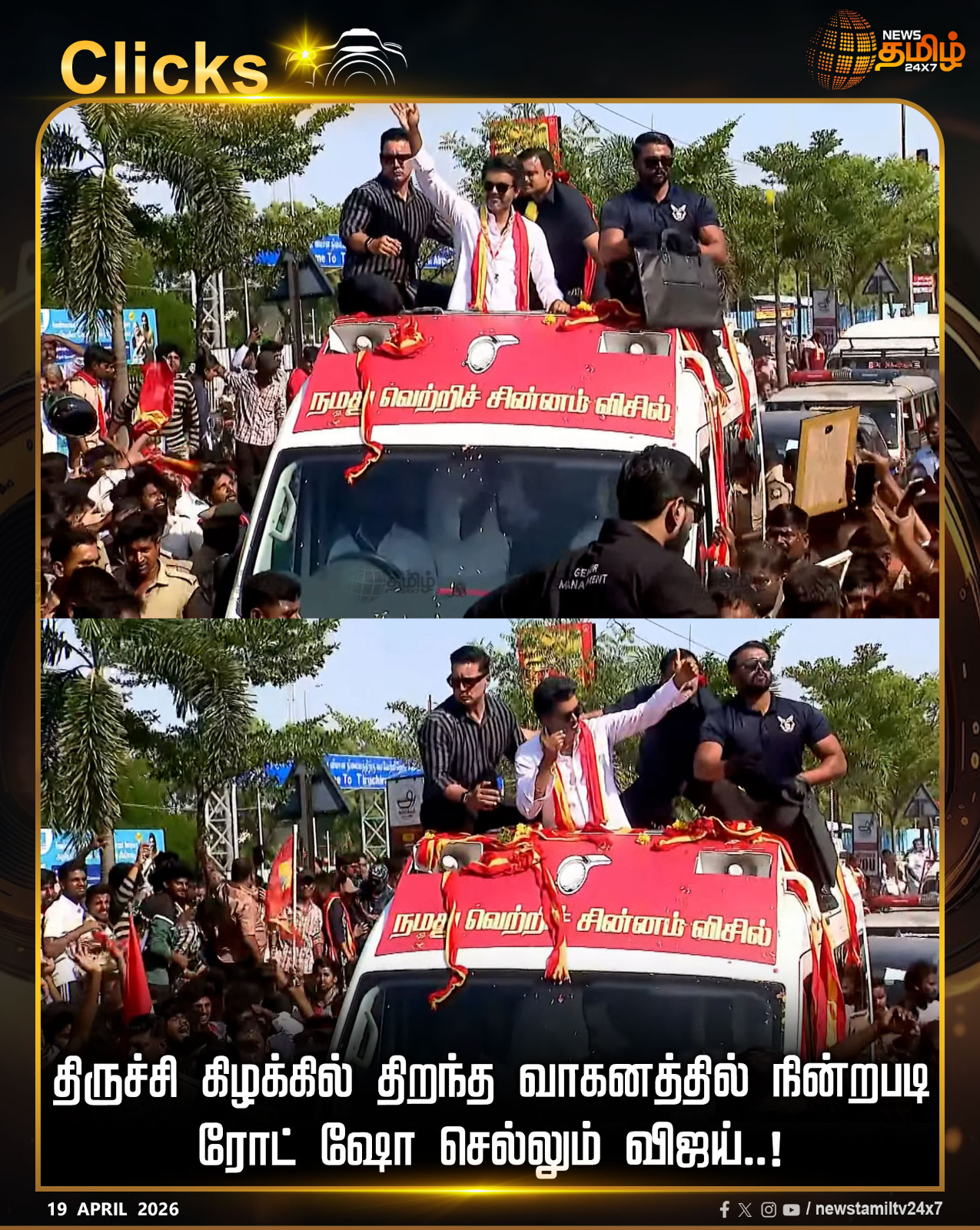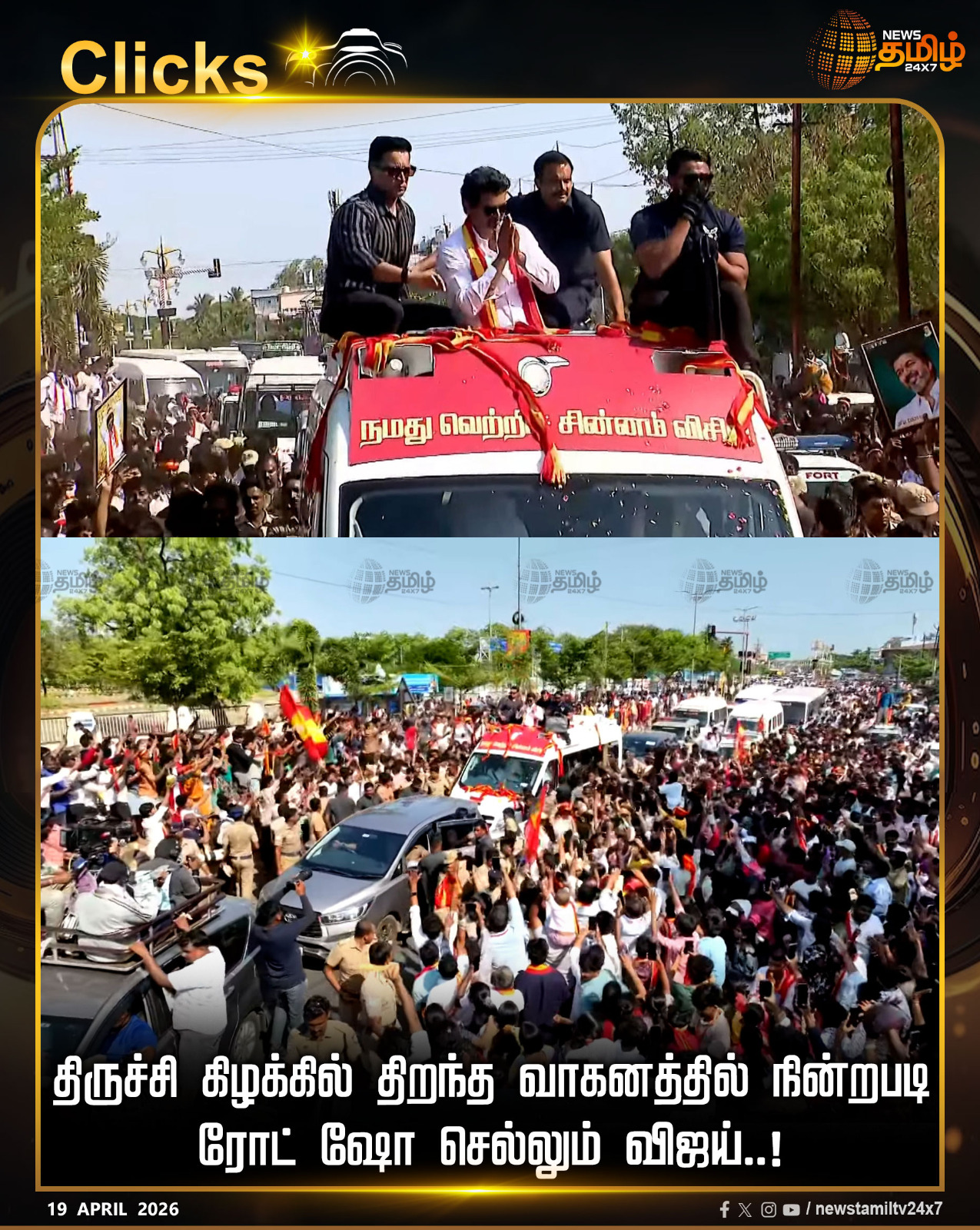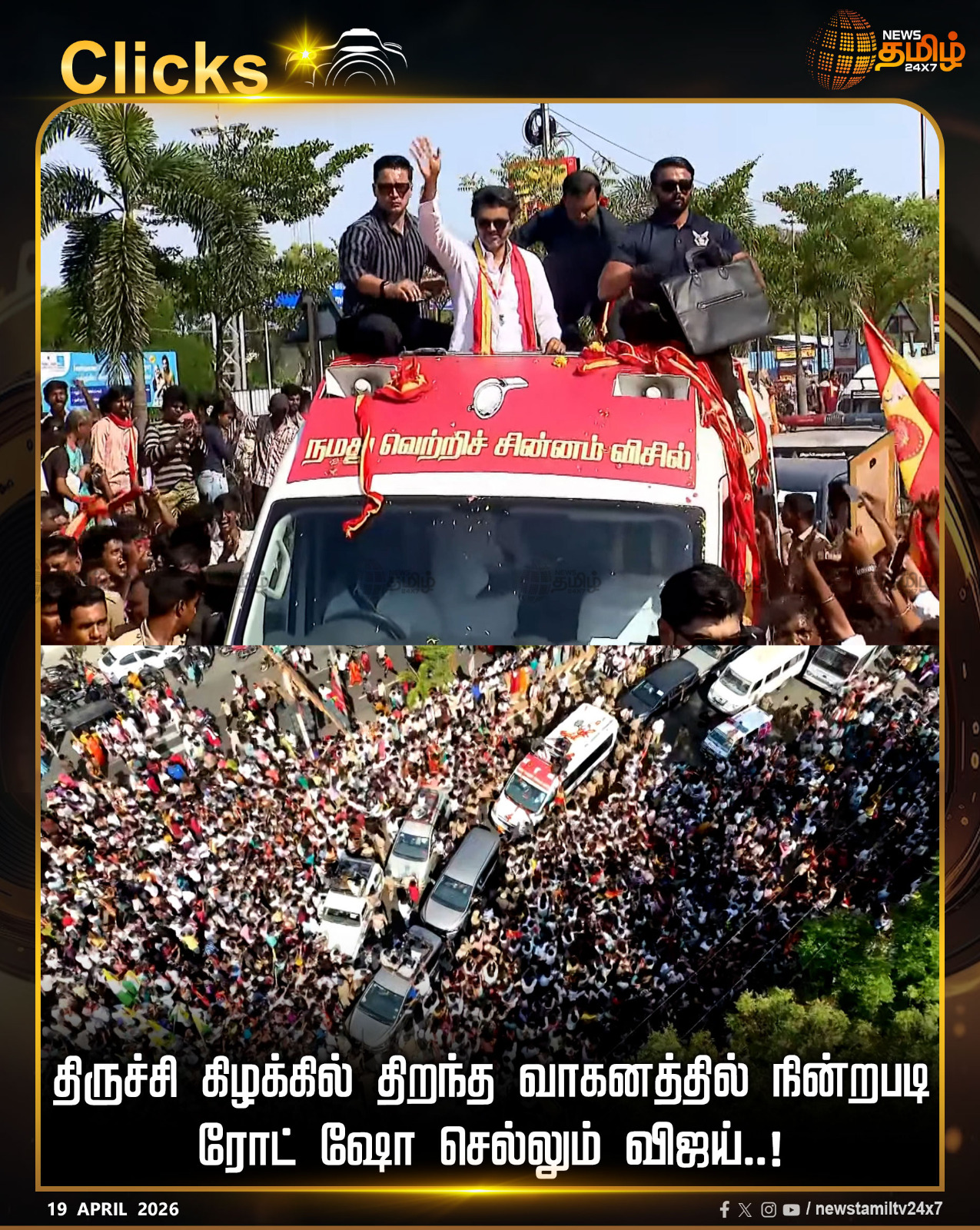 ஏப்ரல் 19, 2026 அன்று திருச்சி கிழக்கு தொகுதியில் காஜாமலை, கே.கே. நகர் பகுதிகளில் பரப்புரை மேற்கொள்கிறார். முன்னதாக பெரம்பூர் தொகுதியில் பரப்புரை செய்த அவர், திமுக அரசை விமர்சித்து "விசில் புரட்சி" தொடக்கம் என முழக்கமிட்டார்.