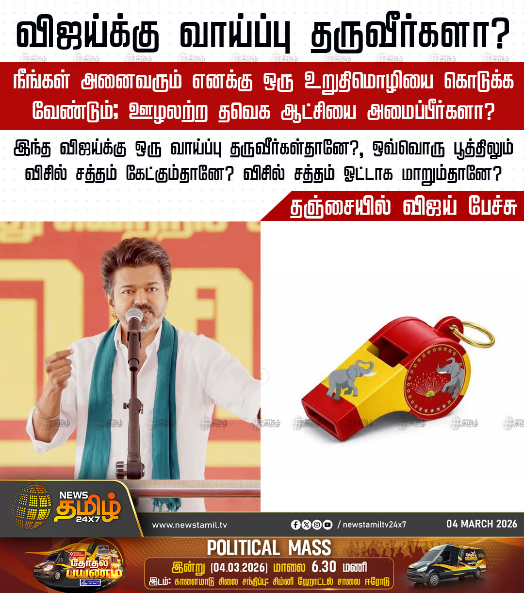 * இந்த விஜய்க்கு ஒரு வாய்ப்பு தருவீர்கள் தானே?, ஒவ்வொரு பூத்திலும் விசில் சத்தம் கேட்கும்தானே? விசில் சத்தம் ஓட்டாக மாறும் தானே?
