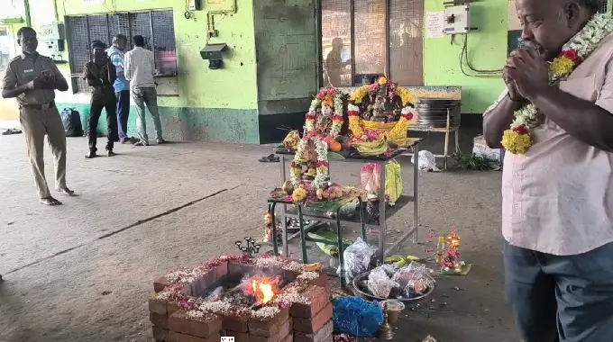 அந்த வகையில் திருவாரூர் பணிமனையில் கிளை மேலாளர் ஜெய்சங்கர் மற்றும் அலுவலர்கள் ஒருங்கிணைந்து இன்று காலை அலுவலகத்தில் கணபதி ஹோமம் செய்து வழிபாடு செய்தனர். அதனைத் தொடர்ந்து யாகம் வளர்த்த சிவாச்சாரியார் அலுவலகம் மற்றும் இன்றி நிறுத்தி வைக்கப்பட்டிருந்த அரசு போக்குவரத்து கழக பேருந்துகளிலும் ஏறி புனித நீர் தெளித்து பரிகாரம் செய்தார். இந்த நிலையில் பணிக்கு வந்த நடத்துனர் மற்றும் ஓட்டுநர்கள் என்ன செய்வதென தெரியாமல் திகைத்தனர்.