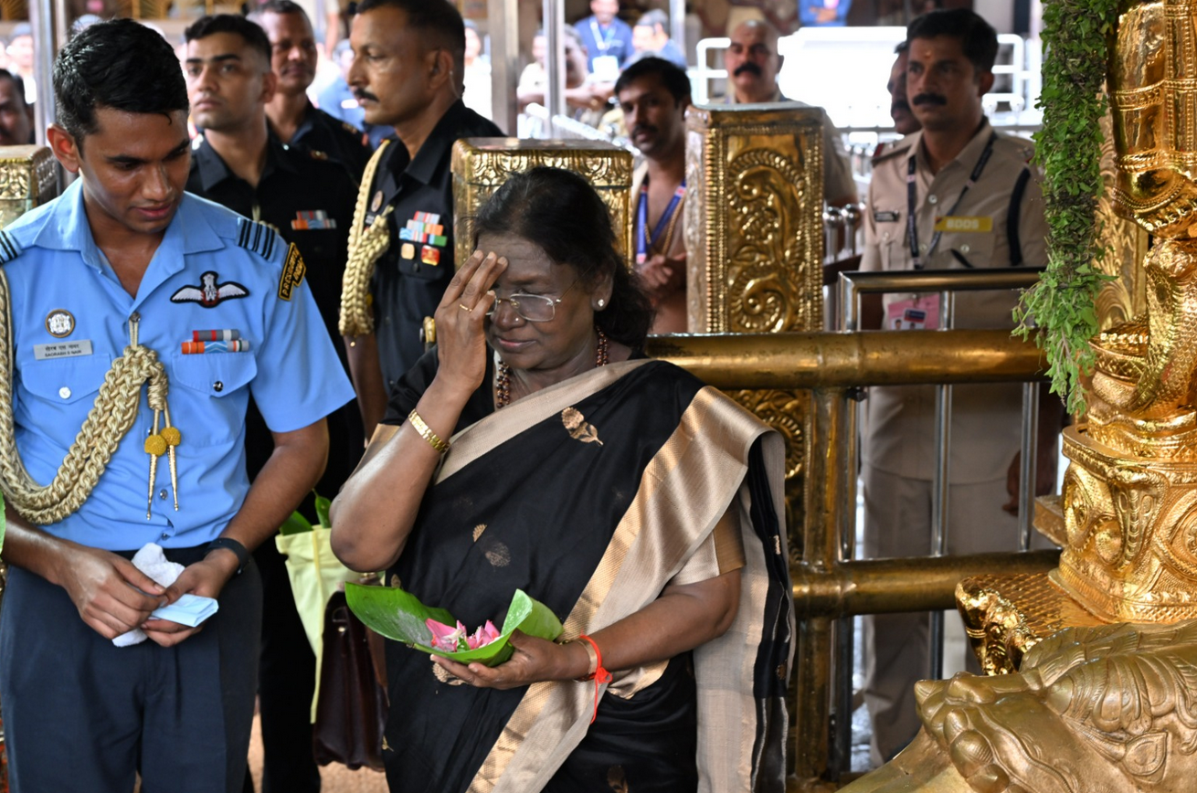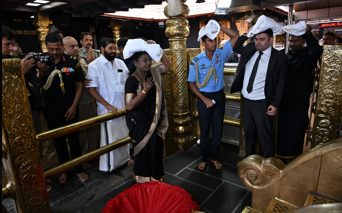 குடியரசுத் தலைவர் திரௌபதி முர்மு, கருப்பு நிற உடையுடன் தலையில் இருமுடி கட்டுடன் சபரிமலை சென்று சாமி தரிசனம் செய்தார்.