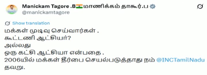 "கூட்டணி ஆட்சியா? ஒரு கட்சி ஆட்சியா? மக்கள் முடிவு செய்வார்கள்" என காங்கிரஸ் எம்பி மாணிக்கம் தாகூர், பதிவிட்டுள்ளார்.
