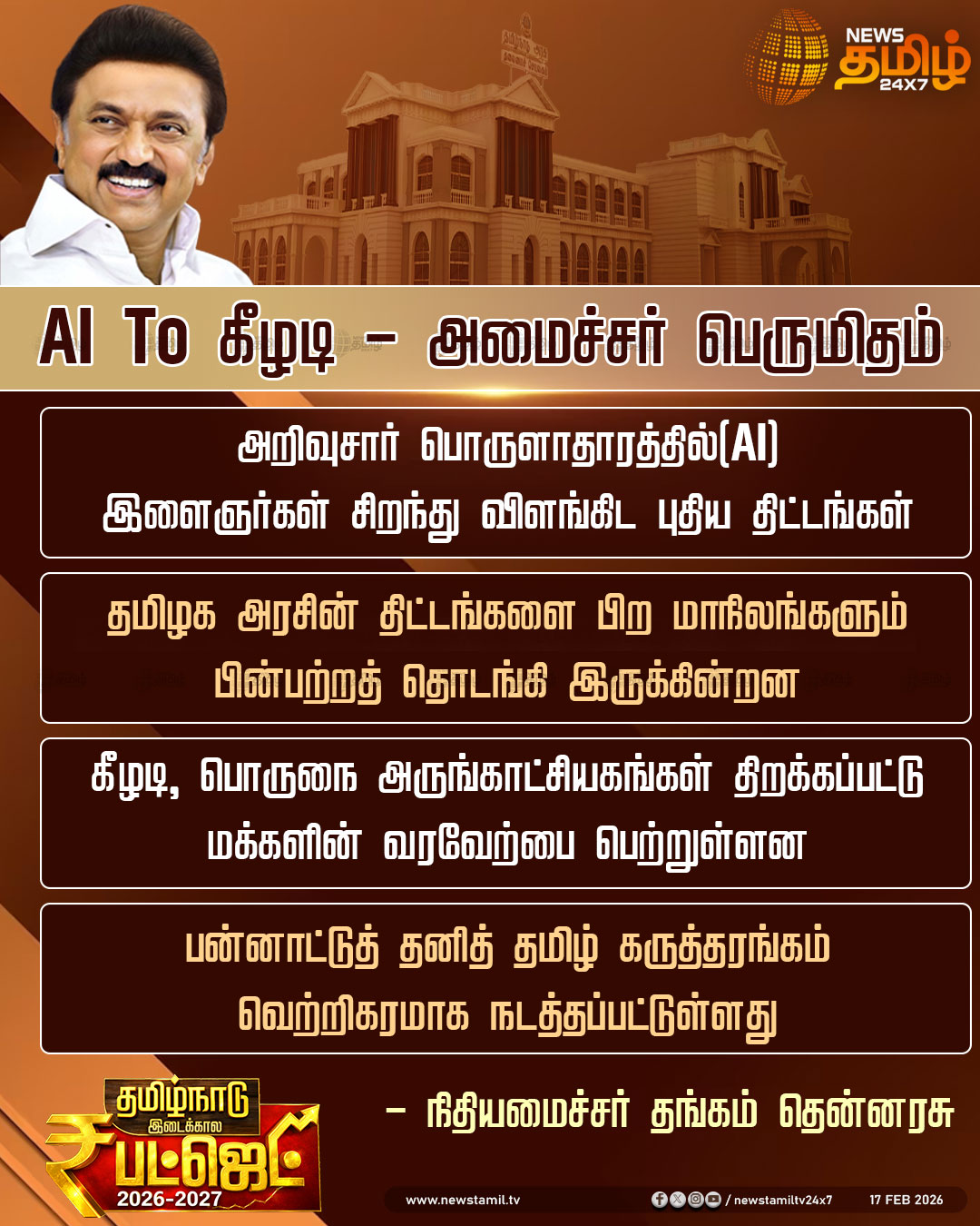 தமிழக அரசின் இடைக்கால பட்ஜெட்டை பேரவையில் இன்று பிப்ரவரி 17ஆம் தேதி, தாக்கல் செய்து, நிதியமைச்சர் தங்கம் தென்னரசு உரையாற்றி வருகிறார்.