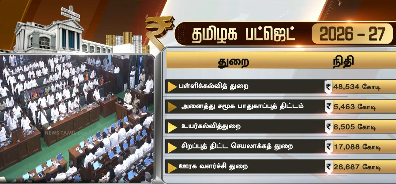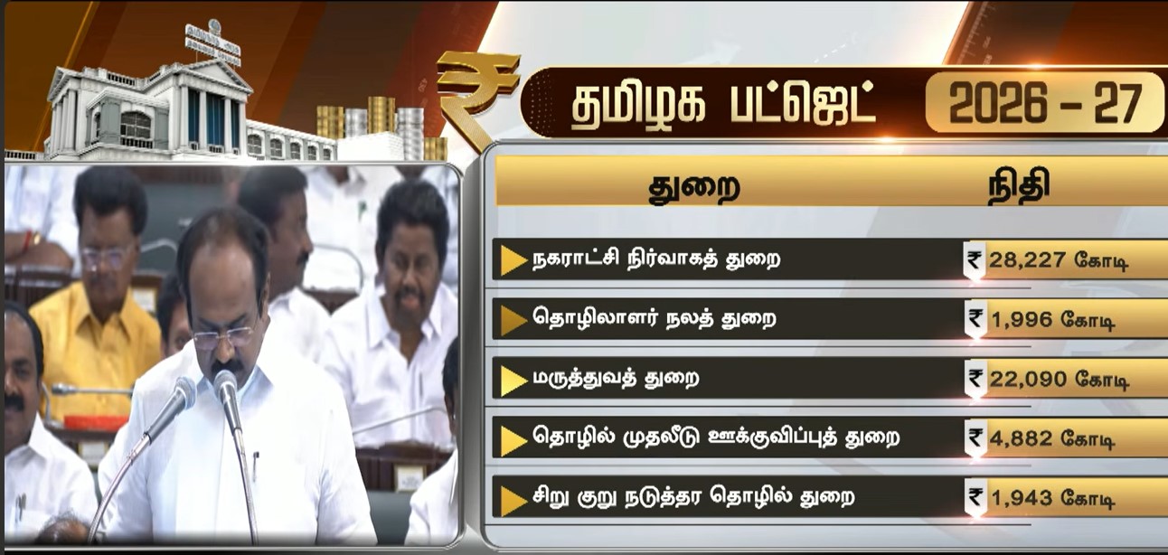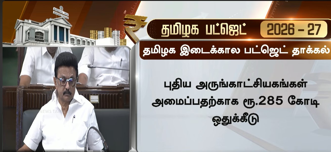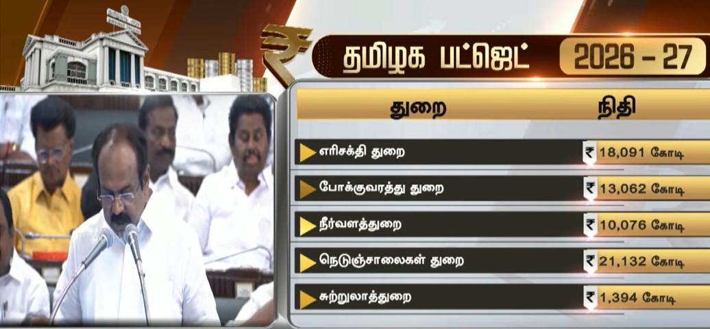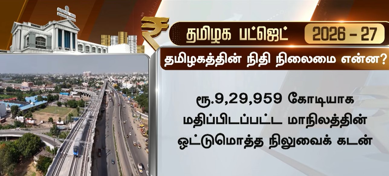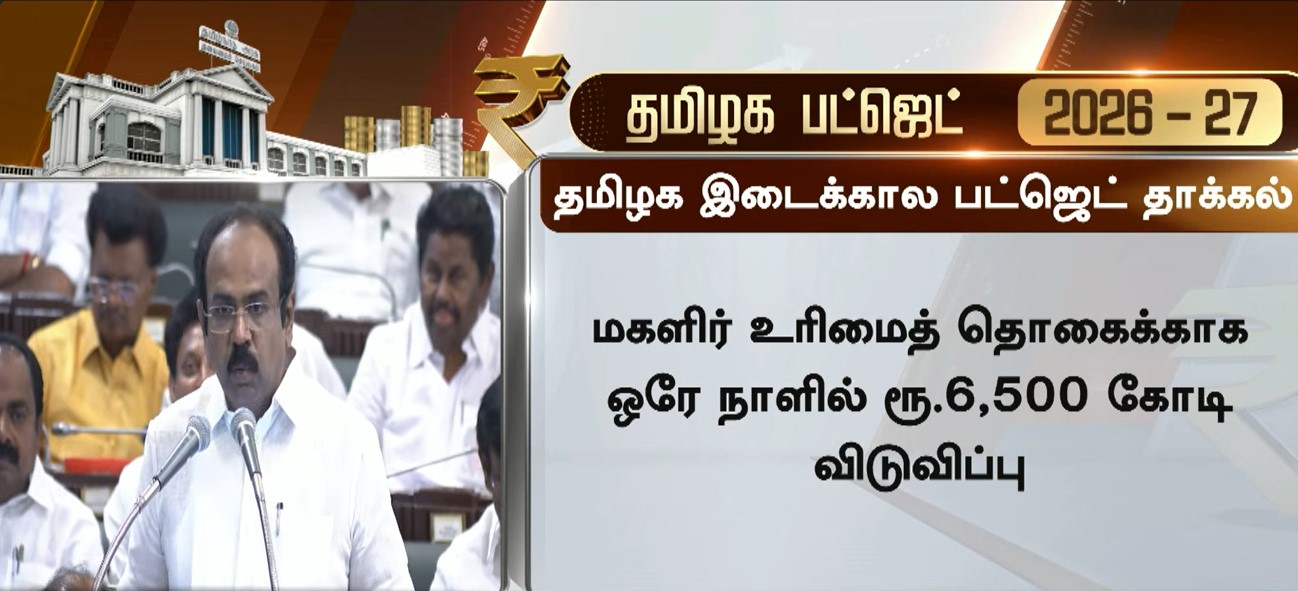 சட்டப்பேரவையில், தமிழகத்தின் இடைக்கால பட்ஜெட்டை தாக்கல் செய்த நிதியமைச்சர் தங்கம் தென்னரசு, வரும் நிதியாண்டில் அரசின் கடன் பத்தரை லட்சம் கோடி ரூபாயை தாண்டும் என கூறியுள்ளார்.2026 - 27ஆம் ஆண்டில் ஒரு லட்சத்து 79 ஆயிரத்து 809 கோடி ரூபாய் கடன் வாங்க திட்டமிட்டிருப்பதாக அவர் தாக்கல் செய்த இடைக்கால பட்ஜெட் அறிக்கையில் குறிப்பிடப்பட்டுள்ளது. மேலும் 60 ஆயிரத்து 143 கோடி ரூபாய் மதிப்பிலான பொதுக்கடனை அரசு திருப்பிச் செலுத்தும் எனவும் தங்கம் தென்னரசு கூறியுள்ளார். தமிழ்நாட்டின் திட்டங்களை பிற மாநிலங்களும் செயல்படுத்துவதாக பெருமிதம்பகுத்துண்டு பல்லுயிர் ஓம்புதல் எனத் தொடங்கும் திருக்குறளை மேற்கோள் காட்டி நிதியமைச்சர் தங்கம் தென்னரசு, நடப்பாண்டிற்கான தமிழ்நாட்டின் இடைக்கால நிதிநிலை அறிக்கையினை சட்டப்பேரவையில் தாக்கல் செய்தார். அனைத்து துறைகளுக்கும் எவ்வளவு நிதி ஒதுக்கப்பட்டிருக்கிறது. அரசின் திட்டங்களுக்கு எவ்வளவு தொகை செலவிடப்பட்டிருக்கிறது என்பது உள்ளிட்டவற்றையெல்லாம் பட்டியலிட்டார் தங்கம் தென்னரசு. தமிழ்நாட்டில் செயல்படுத்தப்படும் திட்டங்களை பிற மாநிலங்களும் செயல்படுத்தி வருவதாக குறிப்பிட்ட அமைச்சர் தங்கம் தென்னரசு, புதிய அருங்காட்சியகங்கள் அமைப்பதற்காக 285 கோடி ரூபாய் ஒதுக்கீடு செய்யப்பட்டதாக அறிவித்தார். மறுவாழ்வு முகாம்களில் வசிக்கும் இலங்கை தமிழர்களுக்கு 630 கோடி ரூபாய் செலவில் 10 ஆயிரத்து 469 வீடுகள் கட்டித் தரப்படும் என அறிவிக்கப்பட்டுள்ளது. மகளிர் உரிமைத் தொகைக்காக ஒரே நாளில் 6 ஆயிரத்து 500 கோடி ரூபாயை விடுவித்து ஏழைகளின் கரங்களுக்கு கொண்டு சேர்த்தவர் முதலமைச்சர் எனவும் இதனால் தமிழ்நாடே இன்ப அதிர்ச்சியில் உள்ளதாகவும் தங்கம் தென்னரசு புகழாரம் சூட்டினார்.நிதி ஒதுக்கீடுகள் - புள்ளிவிவரம்பள்ளிக்கல்வித் துறைக்கு 48 ஆயிரத்து 534 கோடி ரூபாயும், மாற்றுத்திறனாளிகள் நலனுக்காக ஆயிரத்து 471 கோடி ரூபாயும், அனைத்து சமூக பாதுகாப்புத் திட்டங்களுக்கும் 5 ஆயிரத்து 463 கோடி ரூபாயும் நிதி ஒதுக்கப்பட்டிருக்கிறது. உயர்கல்வித்துறைக்கு 8 ஆயிரத்து 505 கோடி, துணை முதல்வர் வசமுள்ள சிறப்புத் திட்ட செயலாக்கத் துறைக்கு 17 ஆயிரத்து 88 கோடியும், விளையாட்டுத் துறைக்கு 718 கோடி ரூபாயும் நிதி ஒதுக்கீடு செய்யப்பட்டுள்ளது. ஊரக வளர்ச்சி துறைக்கு 28 ஆயிரத்து 687 கோடி, நகராட்சி நிர்வாகத் துறைக்கு 28 ஆயிரத்து 227 கோடியும் நிதி ஒதுக்கப்பட்டிருக்கிறது. தொழிலாளர் நலத் துறைக்கு ஆயிரத்து 996 கோடி ரூபாய், மருத்துவத் துறைக்கு 22 ஆயிரத்து 90 கோடி ரூபாய், தொழில் முதலீடு ஊக்குவிப்புத் துறைக்கு 4 ஆயிரத்து 882 கோடி ரூபாய், சிறு குறு நடுத்தர தொழில் த