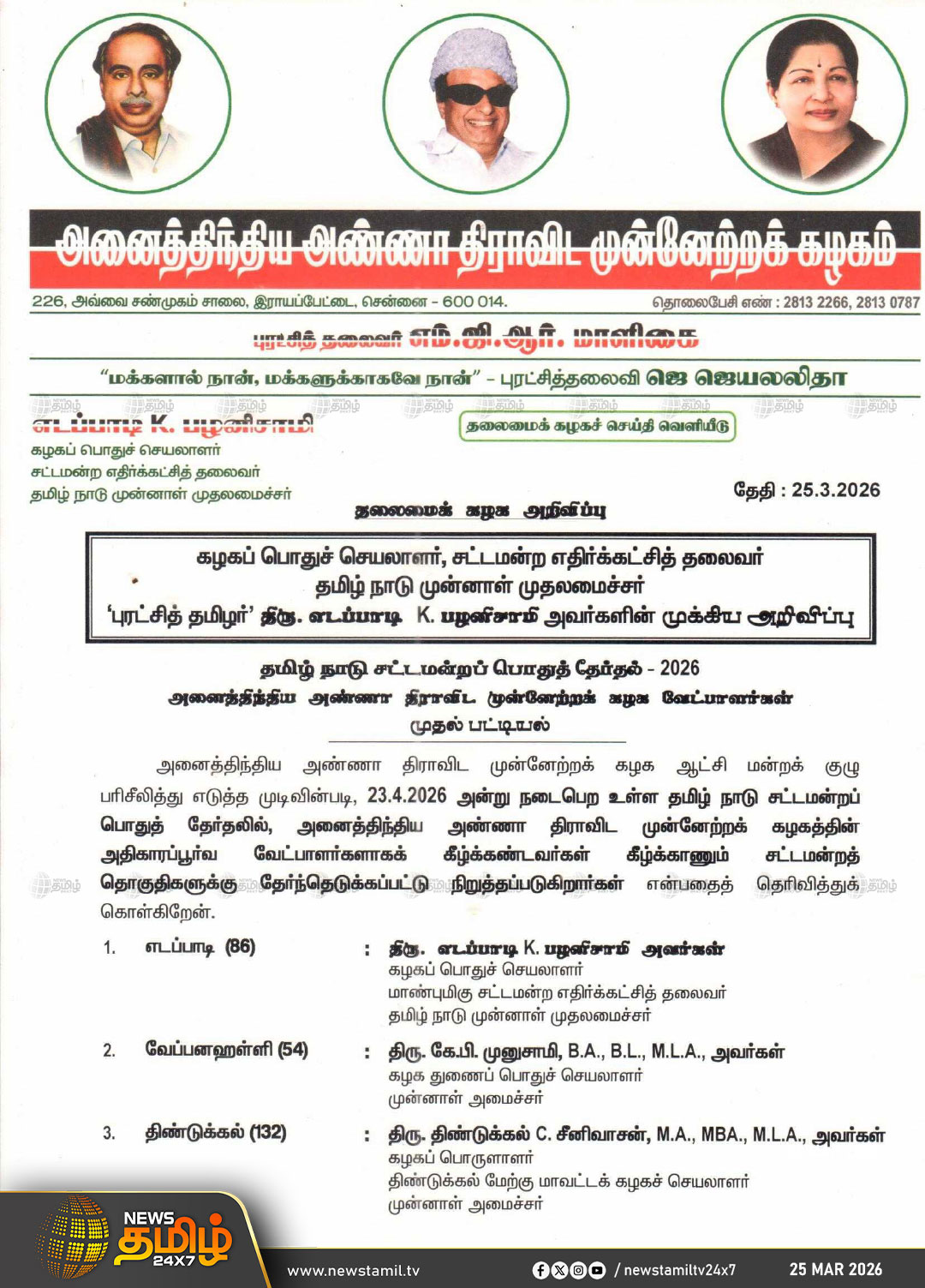 தமிழக சட்டமன்றத் தேர்தலுக்கான முதற்கட்ட வேட்பாளர்களை அதிமுக பொதுச் செயலாளர் எடப்பாடி பழனிசாமி அறிவித்து உள்ளார். 23 தொகுதிகளுக்கான வேட்பாளர்களை அக்கட்சியின் பொதுச் செயலாளர் எடப்பாடி பழனிசாமி வெளியிட்டு உள்ளார்.
