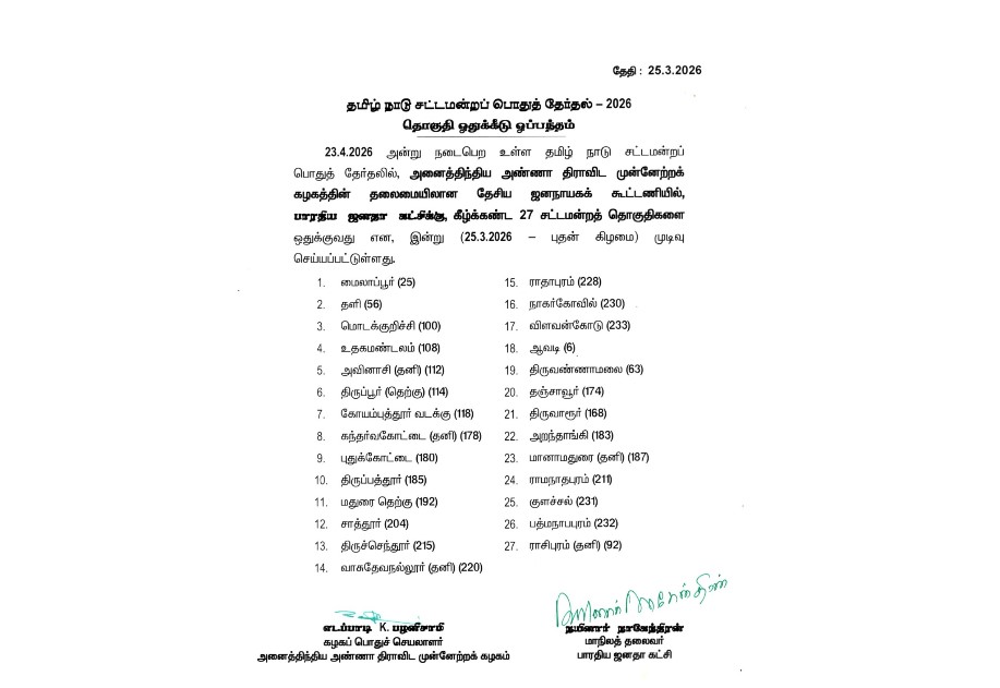 எதிர் வரும் சட்டசபை தேர்தலில், அதிமுக தலைமையிலான கூட்டணியில் போட்டியிடும் பாஜகவுக்கு, ஒதுக்கப்பட்ட தொகுதிகளின் பட்டியலை எடப்பாடி பழனிசாமி வெளியிட்டார்.