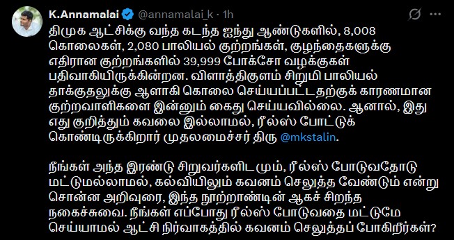 திமுக ஆட்சிக்கு வந்த கடந்த ஐந்து ஆண்டுகளில், 8,008 கொலைகள், 2,080 பாலியல் குற்றங்கள், குழந்தைகளுக்கு எதிரான குற்றங்களில் 39,999 போக்சோ வழக்குகள் பதிவாகி உள்ளன. விளாத்திகுளம் சிறுமி பாலியல் தாக்குதலுக்கு ஆளாகி, கொலை செய்யப்பட்டதற்கு காரணமான குற்றவாளிகளை இன்னும் கைது செய்யவில்லை. ஆனால், இது எது குறித்தும் கவலை இல்லாமல், ரீல்ஸ் போட்டுக் கொண்டிருக்கிறார் முதலமைச்சர்