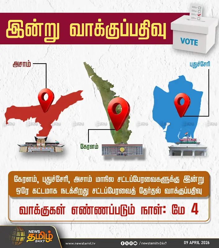 கேரளா, அஸ்ஸாம் ஆகிய மாநிலங்களிலும், புதுச்சேரி யூனியன் பிரதேசத்திலும் இன்று ஒரே கட்டமாக சட்டபேரவைத் தேர்தல் நடைபெறவுள்ளது.
