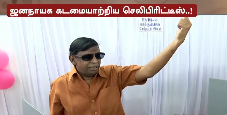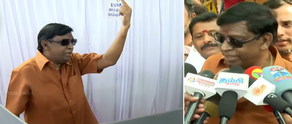 சாலிகிராமம் வாக்குச்சாவடியில் தனது வாக்கைப்பதிவு செய்த காமெடி நடிகர் வடிவேலு மின்னணு வாக்குப்பதிவு இயந்திரத்தில் உள்ள சின்னங்களையும், பொத்தானையும் சிலநிமிடங்கள் உற்று உற்று பார்த்தார். அதன் பிறகு மை வைக்கப்பட்டதும் தனது ஆட்காட்டி விரலை கற்பூரம் காட்டுவதுபோல சுற்றி காண்பித்துவிட்டு வெளியே வந்தார். பின்னர் ஒரு முதியவரின் காதில் ஏதோ ரகசியம் பேசிய அவர் தொடர்ந்து செய்தியாளர்களை சந்தித்தார். காலை முதலே தங்களின் வருகைக்காக காத்திருப்பதாக ஒரு செய்தியாளர்கூற, இதெல்லாம் பெரிய பிட்டு என கிண்டலடித்தார். தொடர்ந்து 12 வயது மற்றும் 16 வயது சிறுவர்கள்கூட கத்துவார்கள், இவ்வளவு ஏன் எனது பேரன்கூட கத்துவான் அதையெல்லாம் அரசியல் புரிதலாக எடுத்துக்கொள்ள முடியுமா? எனக்கூறிய வடிவேலு, வானத்தை நோக்கி அண்ணாந்து பார்த்து வித்தியாச சைகை காட்டினார். அந்த சைகை உதயசூரியன்தான் உதிக்கும் என்று சொல்லாமல் சொல்வதுபோல இருந்தது. அதேபோல், எனக்கு என்ன கண்ணா கெட்டுப் போய்விட்டது, பார்த்து வாக்கு செலுத்த வேண்டும் என்பதற்காகதான் மின்னணு வாக்குப்பதிவு எந்திரத்தை உற்று நோக்கியதாகவும் 3சி பற்றி தெரியவே தெரியாது எனவும் கூறிய அவர், நம் ஓட்டு வேறு யாராவது செலுத்துகிறார்களா? என்பதை பார்க்கவே வெளிநாட்டில் இருந்து வந்து பலர் ஓட்டு செலுத்தி உள்ளதாகவும் கூறினார்