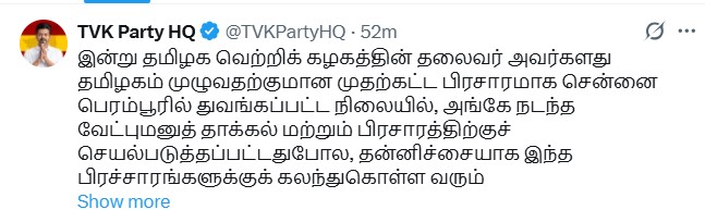 தவெக இணைப் பொதுச் செயலாளர் சி.டி.ஆர்.நிர்மல் குமார் தமது பதிவில் கூறி இருப்பதாவது;