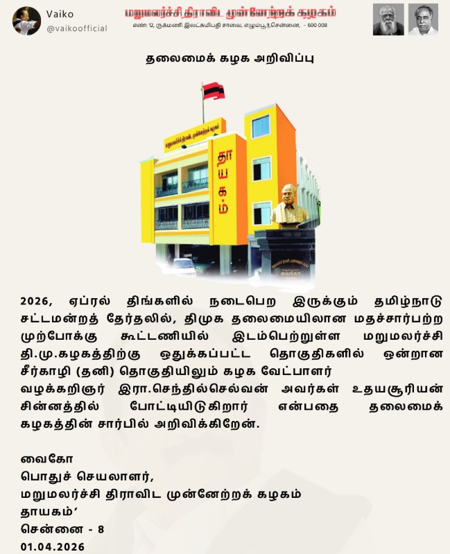 திமுக கூட்டணியில் மதிமுகவிற்கு 4 தொகுதிகள் ஒதுக்கீடு செய்யப்பட்டிருந்தது. இதில் 3 தொகுதிகள் உதயசூரியன் சின்னத்திலும், சீர்காழி தொகுதியில் தனிச் சின்னத்திலும் போட்டியிடுவோம் என்று மதிமுக பொதுச்செயலாளர் வைகோ அறிவித்திருந்தார். ஆனால், இப்போது ஒரு புதிய அறிவிப்பு வந்துள்ளது.