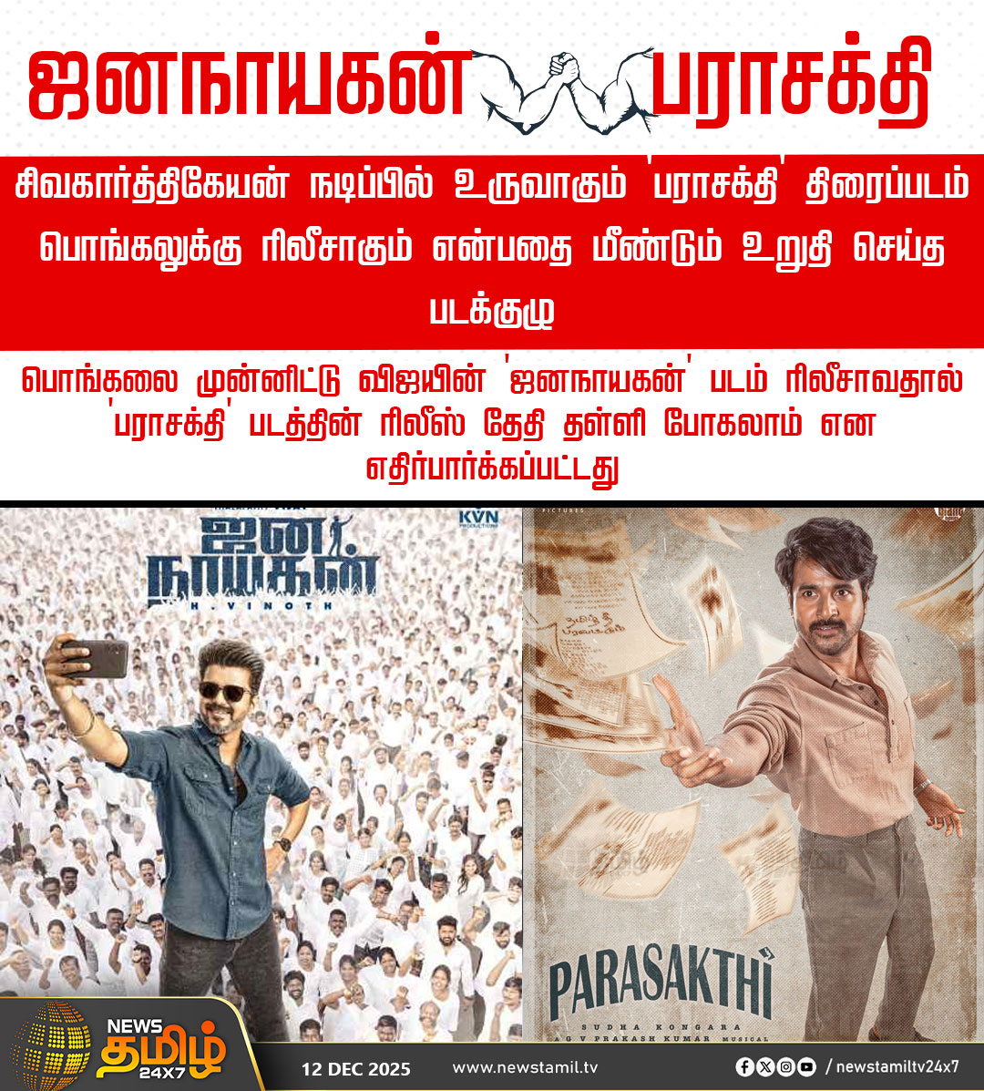 பொங்கலை முன்னிட்டு, விஜய் நடிக்கும் 'ஜனநாயகன்' படம் ரிலீசாவதால் 'பராசக்தி' படத்தின் ரிலீஸ் தேதி தள்ளி போகலாம் என எதிர்பார்க்கப்பட்டது