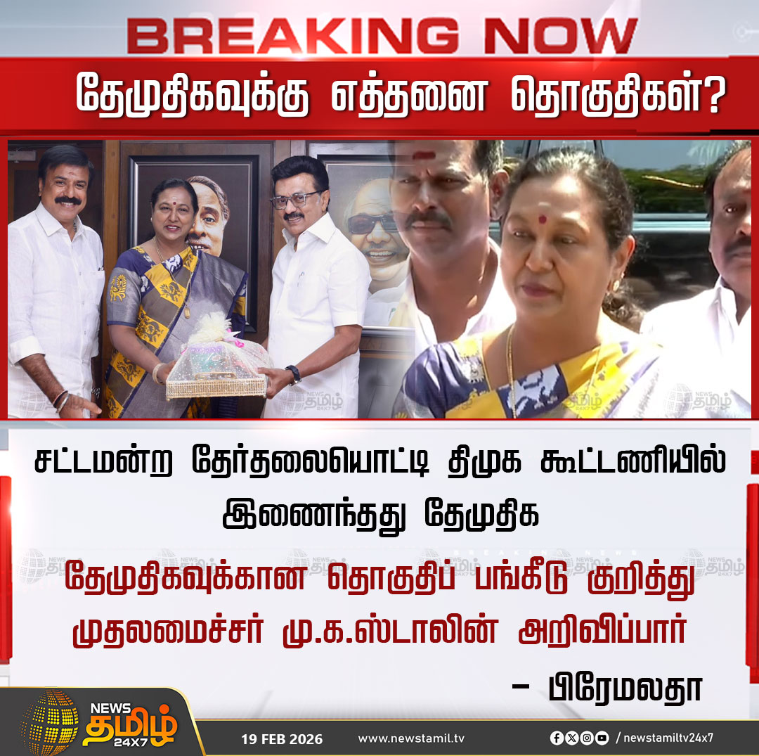 சென்னையில், திமுக தலைமையகமான அண்ணா அறிவாலயத்தில் இன்று பிப்ரவரி 19ஆம் தேதி காலை, தமிழக முதலமைச்சர் மு.க.ஸ்டாலினுடன் தேமுதிக பொதுச் செயலாளர் பிரேமலதா விஜயகாந்த், பொருளாளர் எல்.கே.சுதீஷ் ஆகியோர் சந்திப்பு நிகழ்த்தினர். இந்த சந்திப்பின் போது துணை முதல்வர் உதயநிதி ஸ்டாலின், மூத்த அமைச்சர்கள், கனிமொழி எம்.பி. உள்ளிட்டோர் இருந்தனர்.