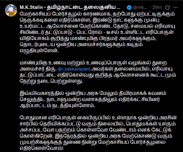 மேற்காசிய போர்ச்சூழல் காரணமாக, தற்போது ஏற்பட்டிருக்கும் நெருக்கடிகளை எதிர்கொள்ள, இரண்டு நாட்களுக்கு முன்பு உயர்மட்ட ஆலோசனை மேற்கொண்டதோடு, சமையல் எரிவாயு சிலிண்டர் தட்டுப்பாடு, பெட்ரோல் - டீசல் உள்ளிட்ட எரிபொருள் விநியோகம் குறித்து பிரதமருக்கும் தொடர்புடைய மத்திய அமைச்சர்களுக்கும் கடிதம் எழுதியுள்ளேன்.