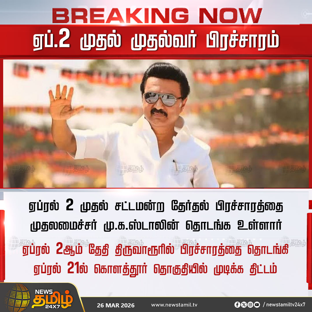 ஏப்ரல் 2ஆம் தேதி அன்று திருவாரூரில் தேர்தல் பிரச்சாரத்தை தொடங்குவதற்கு முதலமைச்சர் மு.க.ஸ்டாலின் திட்டமிட்டு உள்ளார். ஏப்ரல் 6ஆம் தேதி வேட்புமனுவை தாக்கல் செய்வதுடன், 21ஆம் தேதி அன்று கொளத்தூரில் பிரச்சாரத்தை நிறைவு செய்ய உள்ளதாகவும் தகவல் வெளியாகி உள்ளது.