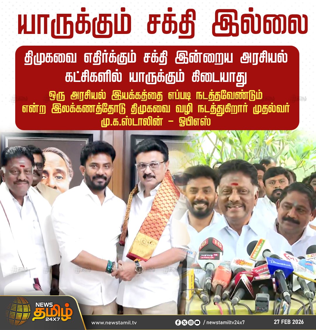 சர்வாதிகார ஆணவப்போக்குடன் அதிமுகவை இபிஎஸ் வழிநடத்திக் கொண்டிருக்கிறார் என ஓ.பன்னீர்செல்வம் விமர்சித்துள்ளார். திமுகவில் ஓ.பன்னீர்செல்வம் முன்னாள் முதல்வரும் அதிமுகவில் இருந்து விலகியவருமான ஓ.பி.எஸ். இன்று பிப்ரவரி 27ஆம் தேதி, திமுகவில் இணைந்தார். தமிழ்நாட்டில் மூன்று முறை முதலமைச்சராக இருந்த ஒருவர், மாற்று கட்சியில் இணைவது இதுவே முதல்முறை.சென்னை, அண்ணா அறிவாலயத்துக்கு வருகை தந்த ஓ.பி.எஸ்.ஐ முதல்வரும் திமுக தலைவருமான மு.க.ஸ்டாலின், பூங்கொத்து கொடுத்து வரவேற்றார். தொடர்ந்து ஓ.பி.எஸ்., அவரது மகனும் அதிமுக முன்னாள் எம்பியுமான ரவீந்திரநாத், உசிலம்பட்டி அதிமுக எம்எல்ஏ ஐயப்பன் ஆகியோர் திமுகவில் இணைந்தனர்.தாய்க் கழகத்தில் இணைந்த மகிழ்ச்சி இதுகுறித்து ஓபிஎஸ் கூறியதாவது:இன்றைக்கு அண்ணா ஆரம்பித்த தாய்க் கழகமான திமுகவில் மகிழ்ச்சியோடு என்னை இணைத்துக் கொண்டிருக்கிறேன். என்னை திமுகவில் இணைத்துக் கொண்ட திமுக தலைவர் மு.க.ஸ்டாலினுக்கு நன்றி தெரிவித்துக்கொள்கிறேன். அரசியலில் அண்ணா, கலைஞர் காட்டிய வழியில் அனைத்து மக்களையும் அரவணைத்துச் செல்கின்ற அரசியல் பண்பாட்டுடன் கட்சியையும் ஆட்சியையும் ஸ்டாலின் வழி நடத்திக் கொண்டிருக்கிறார் என்பதை உணர்ந்து பெரு மகிழ்ச்சியுடன் என்னை தி.மு.க.வில் இணைத்திருக்கிறேன்.சர்வாதிகார ஆணவப்போக்குசர்வாதிகார ஆணவப்போக்குடன் கட்சியை நடத்திக் கொண்டிருக்கிற இபிஎஸ், என்றைக்கும் வெற்றி பெற முடியாத ஒரு சூழ்நிலையை அதிமுகவுக்கு உருவாக்கியிருக்கிறார். ஜெயலலிதாவின் தொண்டர்கள் அனைவரும் திமுகவில் தங்களை இணைத்துக் கொண்டிருக்கிறார்கள். ஒரு அரசியல் இயக்கத்தை நட்போடு அரவணைத்துச் செல்கிறார் ஸ்டாலின். கடந்த 5 ஆண்டு காலம் முதல்வராக அனைத்துத் துறைகளிலும் சிறப்பான ஆட்சியை நடத்தி வருகிறார்.சிறந்த இயக்கமாக திமுகதிமுகவை அழிக்க எந்த சூழ்நிலையில் தடைகள் வந்தாலும் அதனைத் தடுத்து அண்ணா வழியில் சிறந்த திராவிடத் தலைவராக ஸ்டாலின் இருக்கிறார். சர்வாதிகாரத்தனமாக இருக்கும் இபிஎஸ், அதிமுகவை அழிவுப் பாதைக்கு கொண்டு செல்கிறார். அதிமுக தொண்டர்கள் வருத்தத்தில் உள்ளனர். குறிப்பாக தென் மாவட்டத்தில் இருந்து எந்த தலைவரும் வரக் கூடாது என்பதில் இபிஎஸ் முனைப்பு காட்டி வருகிறார். எனவே, தமிழக மக்களின் முன்னேற்றத்திற்கான சிறந்த இயக்கமாக திமுக உள்ளதால் அதில் என்னை இணைத்திருக்கிறேன்.திமுகவால் தான் முடியும்கடந்த காலங்களில் ஏற்பட்ட கசப்பான நிகழ்வுகளுக்கு முடிவு கட்ட வேண்டும் என சுயமாக பொறுமையாக சிந்தித்து இந்த முடிவை எடுத்திருக்கிறேன். அனைவரையும் அரவணைத்துச் செல்கிற போக்கு அதிமுகவில் இப்போத