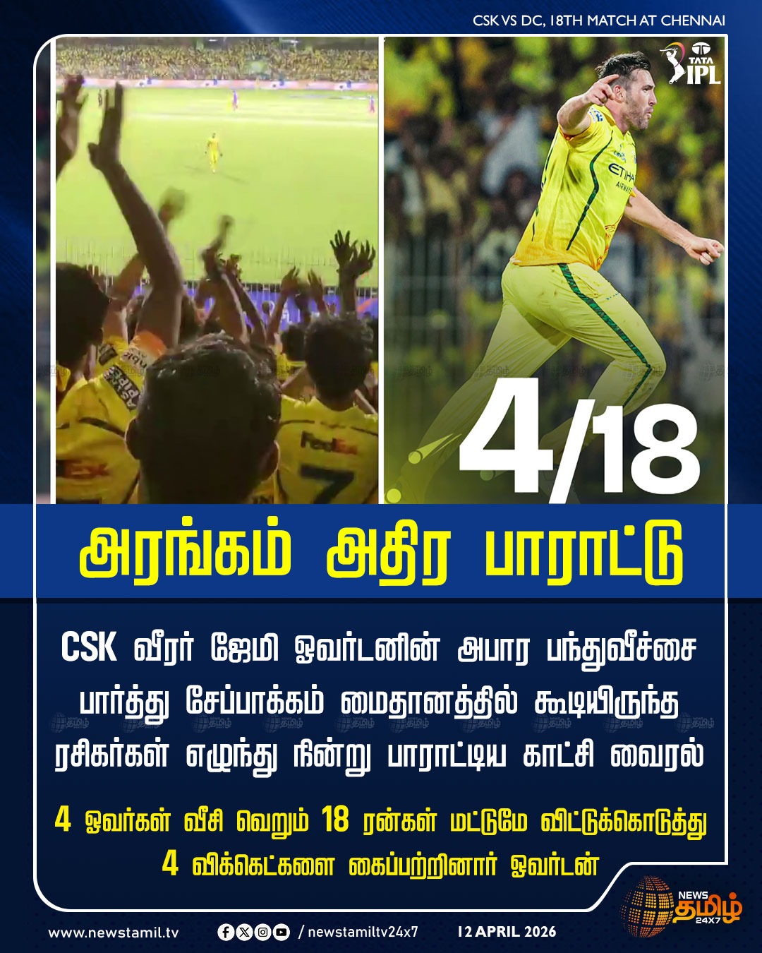 சென்னை வீரர் ஜேமி ஓவர்டனின் அசாத்தியமான பந்துவீச்சை பார்த்து சேப்பாக்கம் மைதானத்தில் கூடியிருந்த ரசிகர்கள் எழுந்து நின்று பாராட்டிய காட்சி, இணையத்தில் வைரலாகி உள்ளது. டெல்லிக்கு எதிரான போட்டியில் 4 ஓவர்கள் வீசி 18 ரன் மட்டுமே விட்டுக்கொடுத்து 4 விக்கெட்டுகளை கைப்பற்றிய ஜேமி ஓவர்டன், சென்னை அணியின் வெற்றிக்கு பெரும் பங்காற்றினார்.