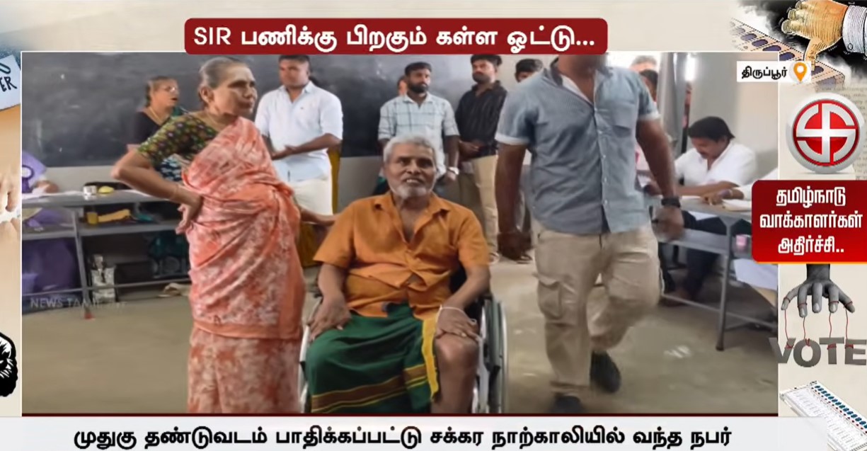 திருப்பூர், சூர்யா நகரை சேர்ந்த 66 வயது முதியவர் சுப்பிரமணியன், விபத்தில் முதுகு தண்டுவடம் பாதிக்கப்பட்டு சிகிச்சை பெற்று வரும் நிலையில், தெற்கு தொகுதிக்குட்பட்ட கேடிசி தனியார் பள்ளியில் அமைக்கப்பட்டிருந்த 118ஆவது வாக்குச்சாவடிக்கு சக்கர நாற்காலியில் வாக்களிக்க வந்தார். ஆனால், அவரது ஓட்டு ஏற்கனவே போடப்பட்டு விட்டதாக வாக்குச்சாவடி அதிகாரி கூறியதால் அதிர்ச்சியடைந்த அவர், தனக்கு சேலஞ்ச் ஓட்டு வழங்கக் கோரி காத்திருப்பில் ஈடுபட்டார்.