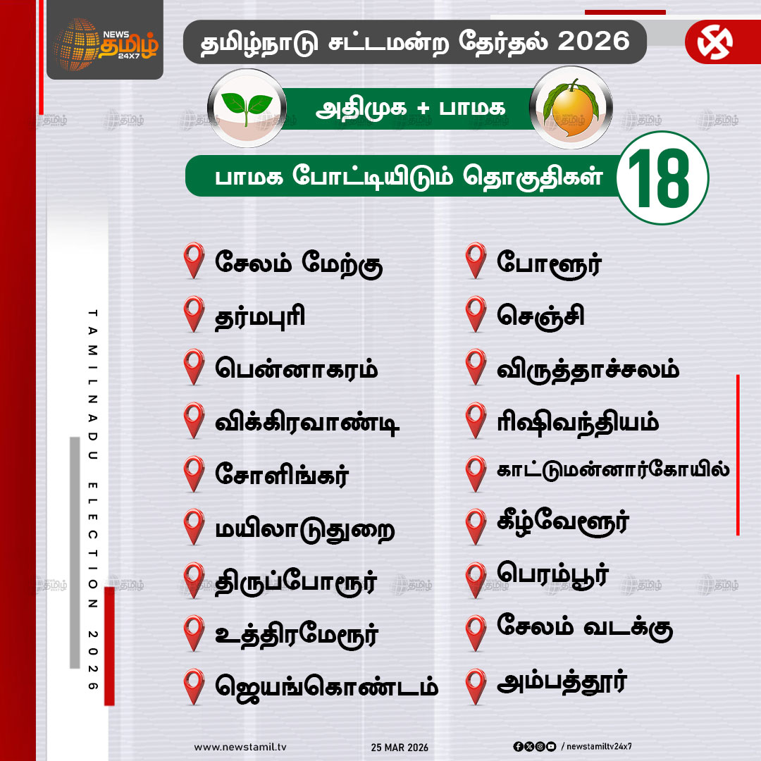 எதிர் வரும் சட்டசபை தேர்தலில், அதிமுக தலைமையிலான கூட்டணியில் போட்டியிடும் பாமகவுக்கு, ஒதுக்கப்பட்ட தொகுதிகளின் பட்டியலை எடப்பாடி பழனிசாமி வெளியிட்டார்.