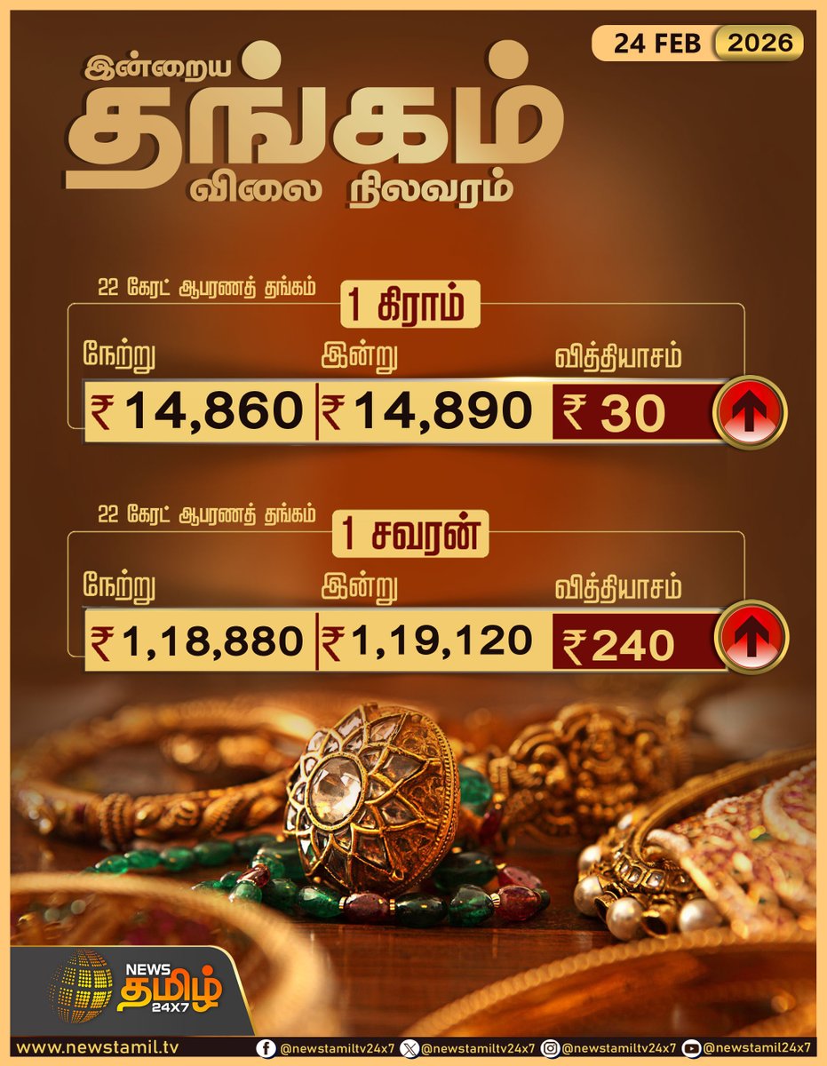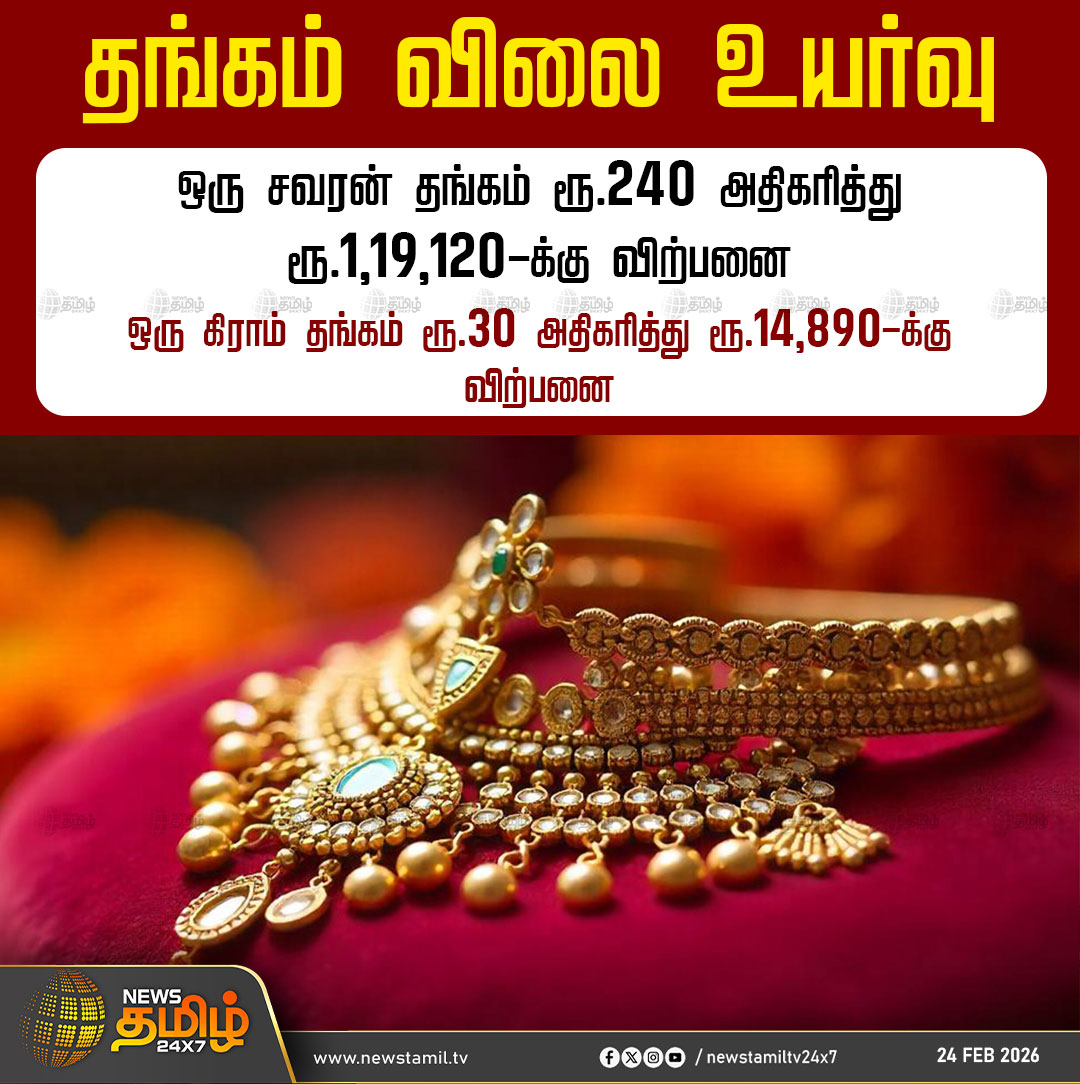 தங்கத்தின் விலை, ஒரு சவரனுக்கு 240 ரூபாய் உயர்ந்து, ஒரு சவரன் ஆபரண தங்கம் 1 லட்சத்து 19 ஆயிரத்து 120 ரூபாய்க்கு விற்பனை ஆனது. பிப்.23 வாரத்தில் முதல் நாளில்... வாரத்தின் முதல் நாளான பிப்ரவரி 23ஆம் தேதி, தங்கம், வெள்ளி விலை அதிரடியாக உயர்ந்தது. சென்னையில், 22 காரட் ஆபரணத் தங்கத்தின் விலை ஒரு கிராமுக்கு ரூ.180 உயர்ந்து, ரூ.14,860க்கு விற்பனை ஆனது. ஒரு சவரனுக்கு ரூ.1,440 உயர்ந்து ரூ.1,18,880க்கு விற்பனை ஆனது. வெள்ளியின் விலை, ஒரு கிராமுக்கு ரூ.10 உயர்ந்து, ஒரு கிராம் ரூ.300க்கு விற்பனை ஆனது. ஒரு கிலோவுக்கு ரூ.10,000 உயர்ந்து ரூ.3,00,000க்கு விற்பனை ஆனது. கடந்த வாரத்தில்... கடந்த வாரத்தில், தங்கம், வெள்ளியின் விலை சற்று குறைந்து மக்களுக்கு ஆறுதல் அளித்தது. தற்போது வாரத்தின் தொடக்கத்திலேயே அவற்றின் விலை மீண்டும் உயரத் தொடங்கியிருப்பது மக்களிடையே அதிர்ச்சியை ஏற்படுத்தியுள்ளது.பிப்.24 தங்கம், வெள்ளி விலை தங்கத்தின் விலை, ஒரு சவரனுக்கு 240 ரூபாய் உயர்ந்து, ஒரு சவரன் ஆபரண தங்கம் 1 லட்சத்து 19 ஆயிரத்து 120 ரூபாய்க்கு விற்பனை ஆனது. ஆபரண தங்கத்தின் விலை ஒரு கிராமுக்கு 30 ரூபாய் உயர்ந்து 14 ஆயிரத்து 890 ரூபாய்க்கு விற்பனை ஆனது. தங்கம் விலை தொடர்ந்து உயர்வதால் மக்கள் அதிர்ச்சி அடைந்துள்ளனர். தங்கம் விலை உயர்ந்த நிலையில் வெள்ளியின் விலையில் சரிவு ஏற்பட்டது. ஒரு கிலோ வெள்ளி 10 ஆயிரம் ரூபாய் குறைந்து 2 லட்சத்து 90 ஆயிரம் ரூபாய்க்கு விற்பனை ஆனது. ஒரு சவரன் தங்கத்தின் விலை நிலவரம்... 18.02.2026 - ரூ.1,13,840 19.02.2026 - ரூ.1,16,00020.02.2026 - ரூ.1,15,36021.02.2026 - ரூ.1,17,44023.02.2026 - ரூ.1,18,88024.02.2026 - ரூ.1,19,120 Related Link இன்றைய ராசி பலன்கள் 24022026
