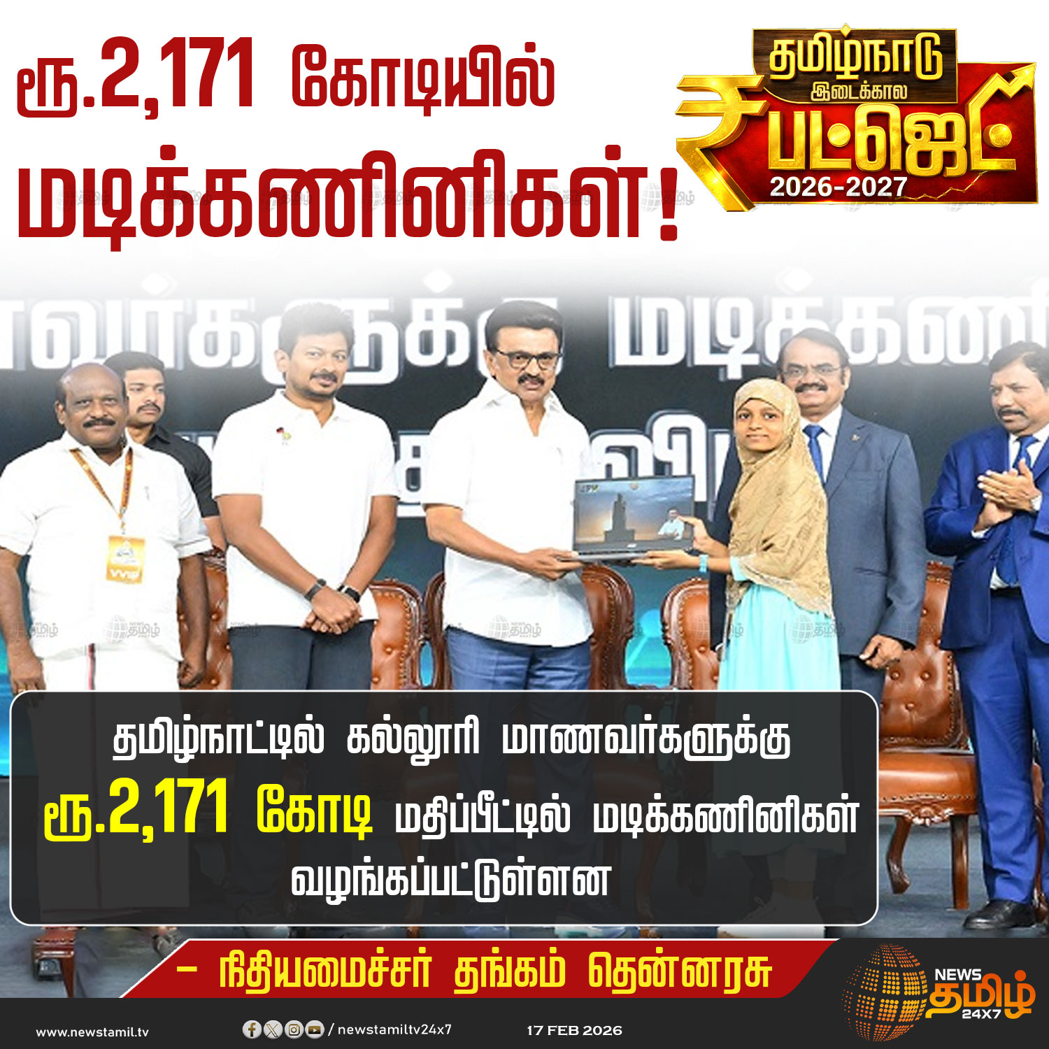 இடைக்கால பட்ஜெட்டை தாக்கல் செய்து, நிதி அமைச்சர் தங்கம் தென்னரசு பேசியதாவது;* தமிழகத்தில் 6 லட்சம் கல்லூரி மாணவர்களுக்கு மடிக்கணிகள் வழங்கப்பட்டுள்ளது. மாநிலத்தில் 38 கலை, அறிவியல் கல்லூரிகள் புதிதாக தொடங்கப்பட்டுள்ளன.* தமிழகத்தில் 5,40,511 மாணவர்கள் தமிழ்ப் புதல்வன் திட்டத்தின் கீழ் மாதம் ரூ.1000 பெற்று வருகின்றனர். இளைஞர் நலன் மற்றும் விளையாட்டு துறைக்கு ரூ.718 கோடி நிதி ஒதுக்கீடு செய்யப்பட்டுள்ளது.* உயர் கல்வித் துறைக்கு ரூ.8,505 கோடியும், சிறப்பு திட்டங்கள் செயலாக்கத் துறைக்கு ரூ.17,088 கோடியும், ஊரக வளர்ச்சித் துறைக்கு ரூ.28,687 கோடியும், மாற்றுத் திறனாளிகள் நலத்துறைக்கு ரூ.1,400 கோடியும், மருத்துவத் துறைக்கு ரூ.22,090 கோடியும், தொழிலாளர் நலத் துறைக்கு ரூ.1,996 கோடியும் நிதி ஒதுக்கீடு செய்யப்பட்டுள்ளது.இவ்வாறு தங்கம் தென்னரசு, தெரிவித்துள்ளார். Related Link தமிழக அரசின் இடைக்கால பட்ஜெட்