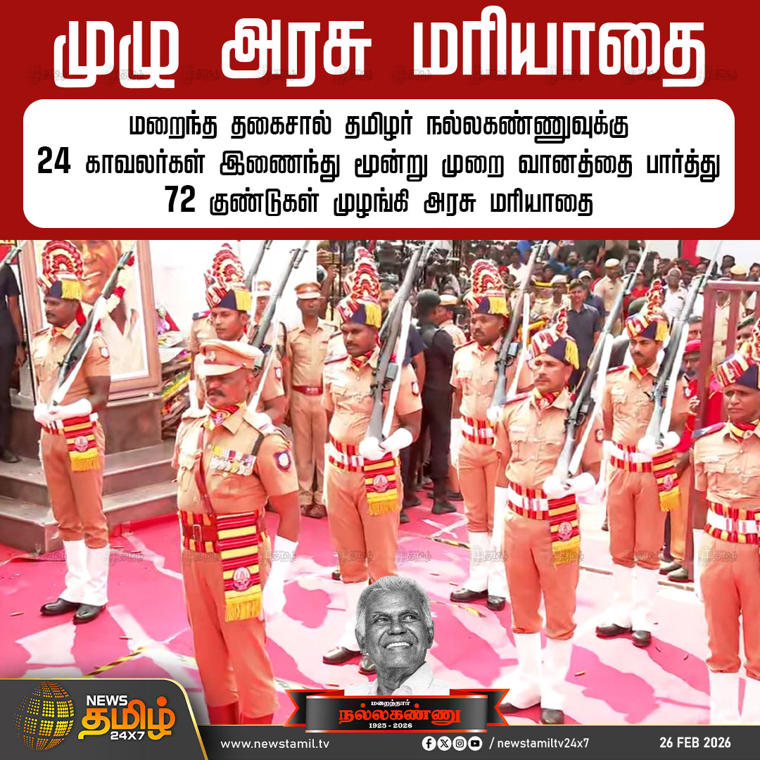 இந்திய கம்யூனிஸ்ட் மூத்த தலைவர் மறைந்த நல்லகண்ணுவின் உடலுக்கு, தமிழக அரசு சார்பில், முழு மரியாதை செய்யப்பட்டது. உடல்நலக் குறைவு காரணமாக உயிரிழந்த அவரது உடல், பொதுமக்களின் அஞ்சலிக்காக சென்னை, தியாகராய நகரில் உள்ள கட்சியின் தலைமை அலுவலகத்தில் வைக்கப்பட்டது. அவரது உடல் ராஜிவ் காந்தி அரசு மருத்துவக் கல்லூரியில் ஒப்படைக்கப்படுகிறது.