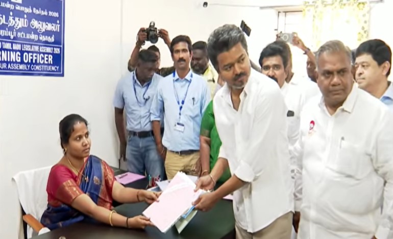 முதலமைச்சர் மு.க.ஸ்டாலின் கொளத்தூரில் வேட்புமனு தாக்கல் செய்த அதேநேரத்திலேயே, சில நொடிகள்கூட மாறாமல் பெரம்பூர் தொகுதியில் தனது வேட்புமனுவை தாக்கல் செய்தார் நடிகரும், தமிழக வெற்றிக்கழகத்தின் தலைவருமான விஜய். திருச்சி கிழக்கு மற்றும் பெரம்பூர் ஆகிய 2 தொகுதிகளில் களம் காணும் நிலையில், முதலில் பெரம்பூர் தொகுதிக்கான வேட்புமனுவை தாக்கல் செய்தார். வியாசர்பாடி அம்பேத்கர் கலைக்கல்லூரியில் தேர்தல் அலுவலர் கீதாவிடம் வேட்புமனு தாக்கல் செய்ய வந்த விஜய்யின் காரை மக்கள் கூட்டம், எறும்புபோல் மொய்த்தது. வீட்டிலிருந்து கிளம்பியது முதல் வேட்புமனு தாக்கல் செய்ய உள்ளே நுழைந்தது வரை மக்கள் வெள்ளம் கண்ணையும், மனதையும் குளிர வைக்க அந்த வைபிலேயே பிரச்சாரம் மேற்கொண்டார் விஜய்.