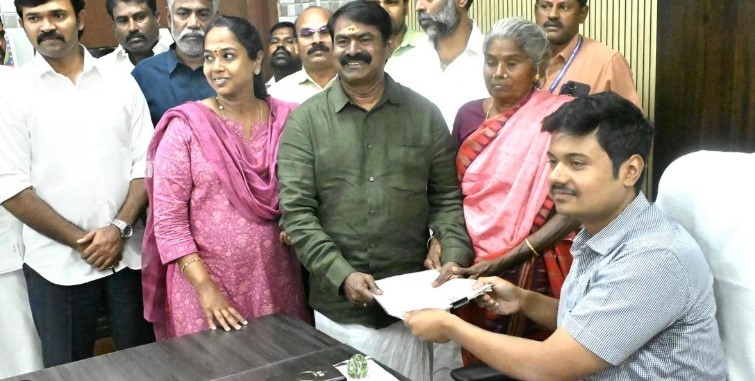காரைக்குடி சட்டமன்ற தொகுதியில் போட்டியிடும் நாம் தமிழர் கட்சி ஒருங்கிணைப்பார் சீமான், தேவகோட்டை சார் ஆட்சியர் அலுவலகத்தில் தனது மனைவி கயல்விழி மற்றும் தாய் அன்னம்மாளுடன் வந்து வேட்புமனு தாக்கல் செய்தார். அதேபோல், மாற்றுவேட்பாளராக கயல்விழியும் வேட்புமனு தாக்கல் செய்தார். இதனை தொடர்ந்து செய்தியாளர்களை சந்தித்த சீமான், முதலமைச்சர் மு.க.ஸ்டாலின் கொடுக்கும் 8,000 ரூபாய் டோக்கனை வைத்து எதை வேண்டுமானாலும் வாங்கலாமா? இழந்த மானத்தை வாங்க முடியுமா? வெட்டி விற்ற மலையை வாங்க முடியுமா? அல்லது அள்ளி விற்ற மணலை தான் வாங்க முடியுமா? என கேள்வி எழுப்பினார். படித்துவிட்டு வேலை இல்லாமல் இருக்கும் இளைஞர்களுக்கு வேலை வழங்க வேண்டுமா? அல்லது மாதம் ரூபாய் 4 ஆயிரம் வழங்க வேண்டுமா? என்று விஜயின் வாக்குறுதியை சாடிய சீமான், கொலை செய்ய விரும்பினால் அந்த உணர்வுக்கு மதிப்பு கொடுத்து கொலை செய்ய அனுமதிக்கலாமா? அதுபோன்றுதான் மது விற்க அனுமதி வழங்கப்படுவது என தமிழக அரசை விமர்சனம் செய்தார்.
