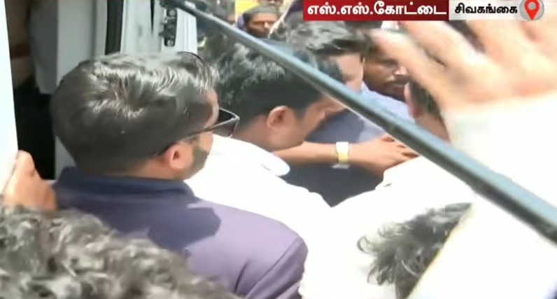 சிவகங்கை அருகே விஜய் வந்த வாகனத்தை நிறுத்தி பறக்கும் படை சோதனை நடத்தினர். முன் இருக்கையில் அமர்ந்திருந்த விஜய், எழுந்து நின்று சோதனைக்கு ஒத்துழைப்பு தந்தார்.