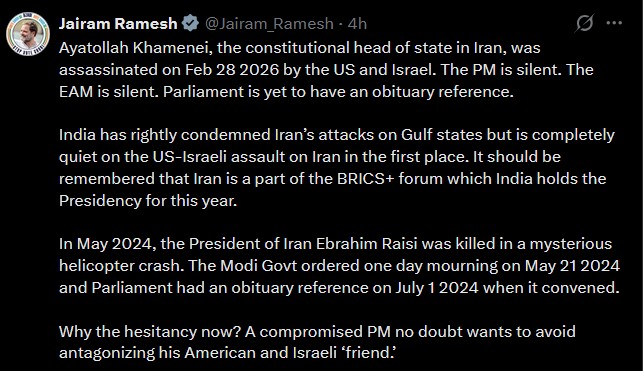 ஈரான் அரசமைப்பு சட்டத்தின் தலைவரான அயதுல்லா கமேனி, பிப்ரவரி 28, 2026 அன்று அமெரிக்கா, இஸ்ரேல் தாக்குதலில் படுகொலை செய்யப்பட்டார். ஆனால், இதுகுறித்து பிரதமர் மௌனம் காக்கிறார். வெளியுறவு அமைச்சரும் அமைதியாக இருக்கிறார். நாடாளுமன்றத்தில் இன்னும் இரங்கல் குறிப்புகூட இல்லை. வளைகுடா நாடுகள் மீதான தாக்குதலுக்கு ஈரானுக்கு இந்தியா கண்டனம் தெரிவித்து உள்ளது. ஆனால், ஈரான் மீதான அமெரிக்கா - இஸ்ரேல் தாக்குதலுக்கு இந்தியா அமைதி காக்கிறது.