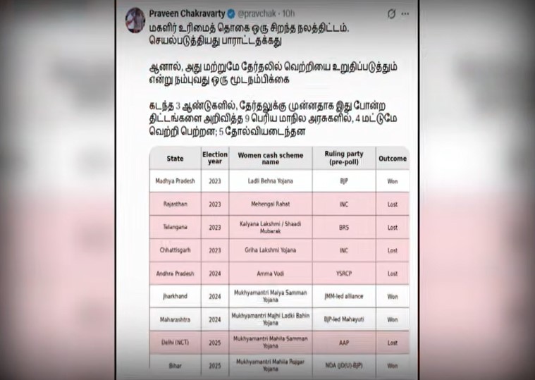 மகளிருக்கான திட்டத்தை அறிவித்த சத்தீஸ்கர், ராஜஸ்தான் ஆகிய மாநிலங்களில் தங்களது சொந்த கட்சியே ஆட்சியை இழந்திருக்கிறது என்ற பட்டியலை பிரவீன் சக்கரவர்த்தி வெளியிட்டுள்ளார். டெல்லி, தெலங்கானா, ஆந்திராவிலும் தேர்தலுக்கு முன்பு இதேபோல் அறிவித்து, அங்கு ஆண்டு கொண்டிருந்த கட்சிகள் தேர்தலில் தோல்வி அடைந்ததாக அவர் பதிவிட்டிருப்பது புதிய புயலை கிளப்பியுள்ளது. இதேபோன்ற திட்டங்களை அறிவித்து, மத்தியப்பிரதேசத்தில் பாஜகவும், மகாராஷ்டிரா மற்றும் பீகாரில் பாஜகவின் என்டிஏ கூட்டணியும் ஆட்சியை தக்க வைத்திருப்பதை அவர் சுட்டிக் காட்டியுள்ளார். ஜார்க்கண்டில் ஹேமந்த் சோரனின் ஜார்கண்ட் முக்தி மோர்ச்சா மீண்டும் ஆட்சியை தக்க வைத்துக் கொண்டதையும் பிரவீன் சக்கரவர்த்தி சுட்டிக் காட்டியுள்ளார். அதேவேளையில், பிரவீன் சக்கரவர்த்தி சுட்டிக் காட்டியுள்ள அந்த 5 மாநிலங்களிலும் வெவ்வேறு பிரச்சனைகள் இருந்ததையும் நினைவு கூர வேண்டிய அவசியம் உள்ளது.